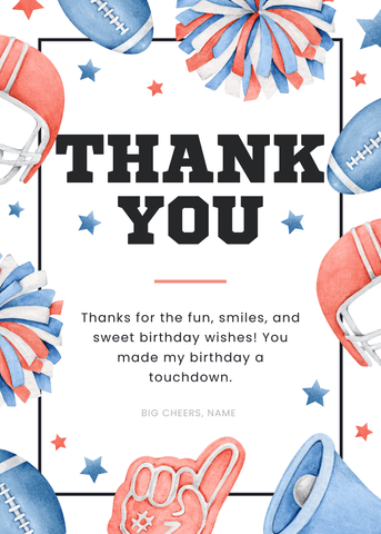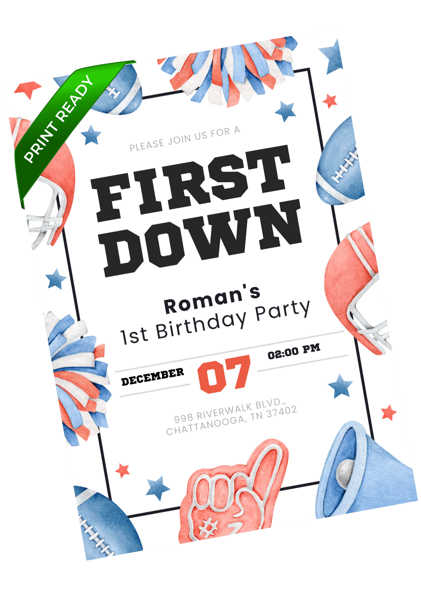 A bright, playful football-themed invitation with pom poms, foam fingers, and sporty icons in red, white, and blue. Great for kids who love team spirit and big-game vibes. Personalize in Canva and send an invite full of energy and color.