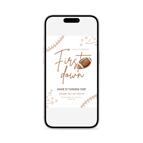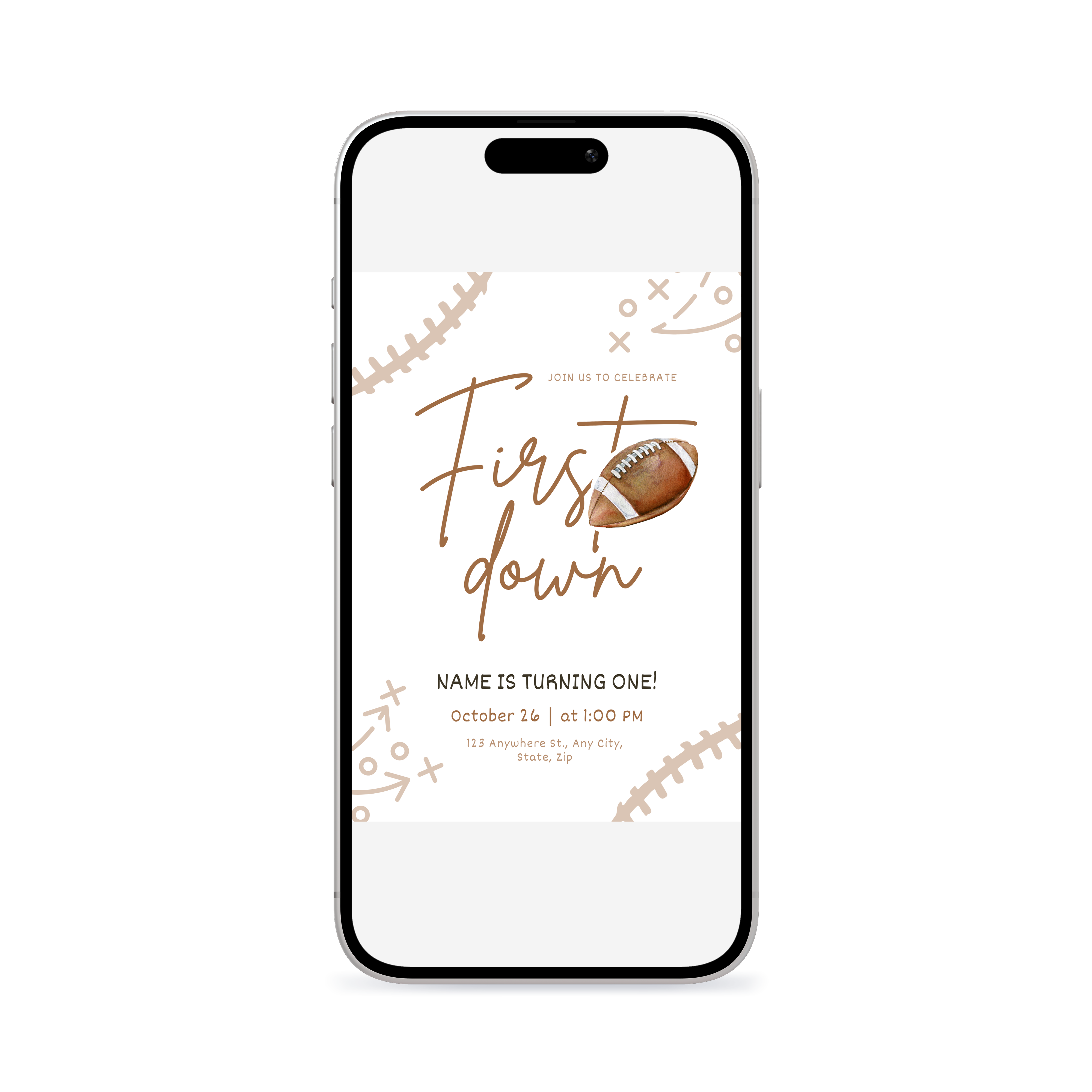 Sleek, modern football theme 1st birthday invitation template. Clean design meets contemporary style in this Canva-ready template. Perfect for parents who love minimalist aesthetics with maximum impact.