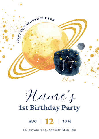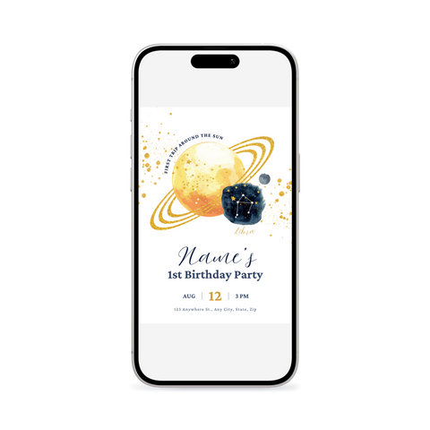 Sleek, modern first trip around the sun theme 1st birthday invitation template. Clean design meets contemporary style in this Canva-ready template. Perfect for parents who love minimalist aesthetics with maximum impact.
