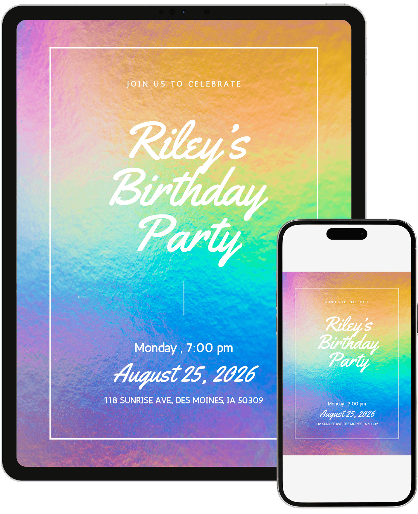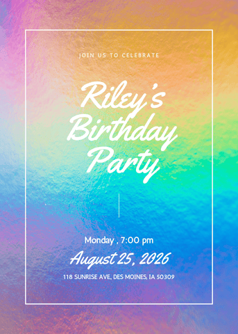 A rich rainbow-glitter invitation with deeper hues and a bold gradient effect. Perfect for parents looking for a lively, colorful design that still feels refined. Personalize in Canva and share a standout invite with a bright, modern finish.