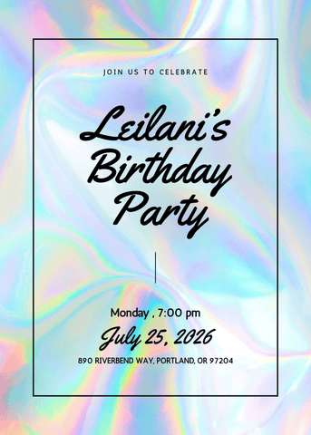 A bold rainbow-glitter style invitation with holographic tones and a modern layout. Great for families who want a bright, energetic design with standout color. Customize in Canva and share a fun, eye-catching invite.