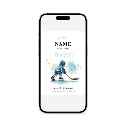 Sleek, modern hockey theme 1st - 5th birthday invitation template. Clean design meets contemporary style in this Canva-ready template. Perfect for parents who love minimalist aesthetics with maximum impact.