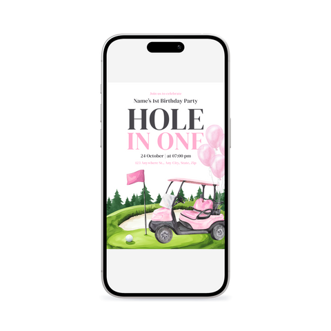 Sleek, modern hole in one theme 1st birthday invitation template. Clean design meets contemporary style in this Canva-ready template. Perfect for parents who love minimalist aesthetics with maximum impact.
