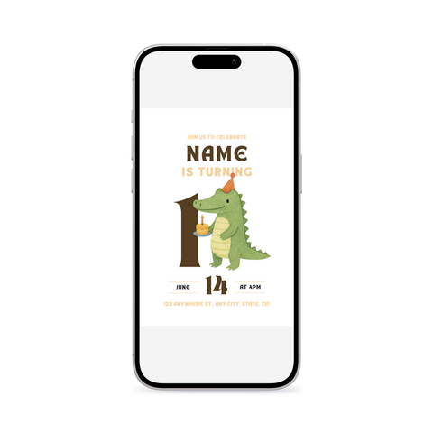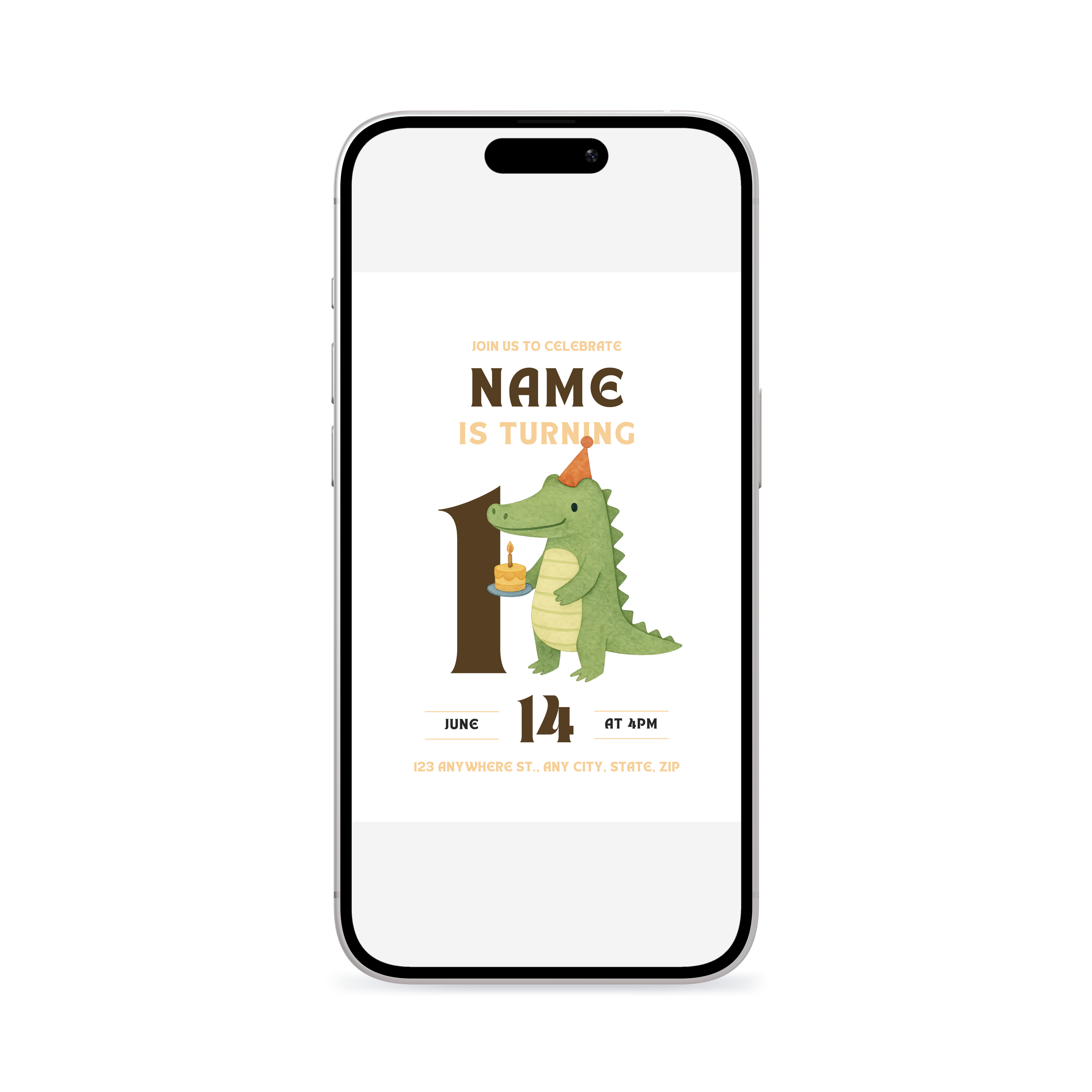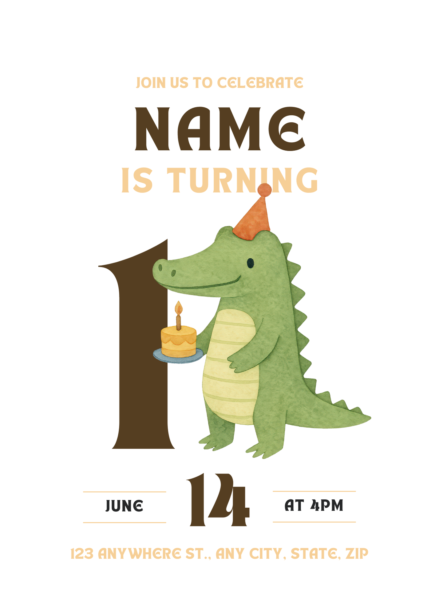 A clean, modern crocodile birthday invitation with soft green tones and subtle party elements. Perfect for parents who want a playful theme without overwhelming colors. Edit in Canva and share a fresh, friendly invite for a relaxed celebration.