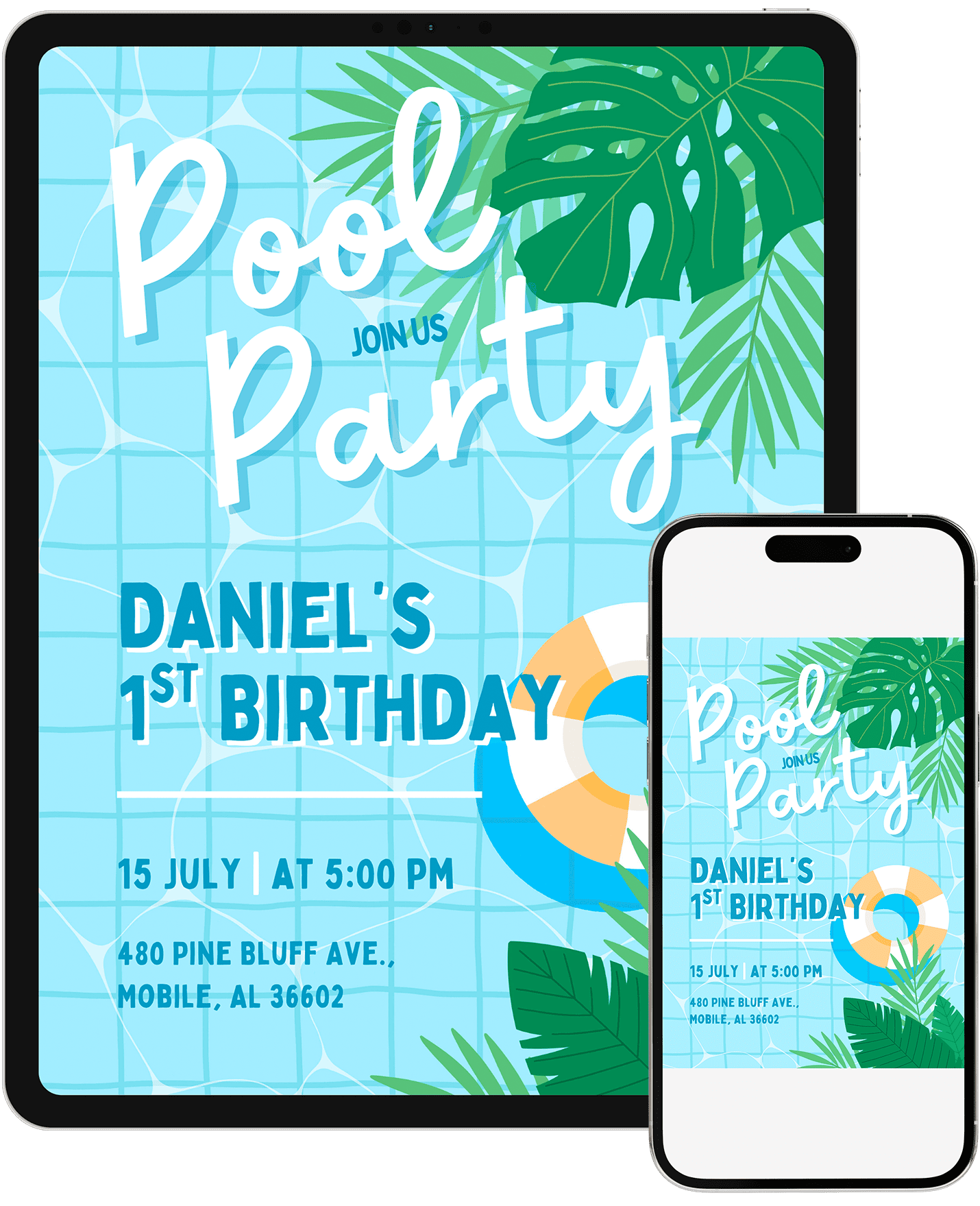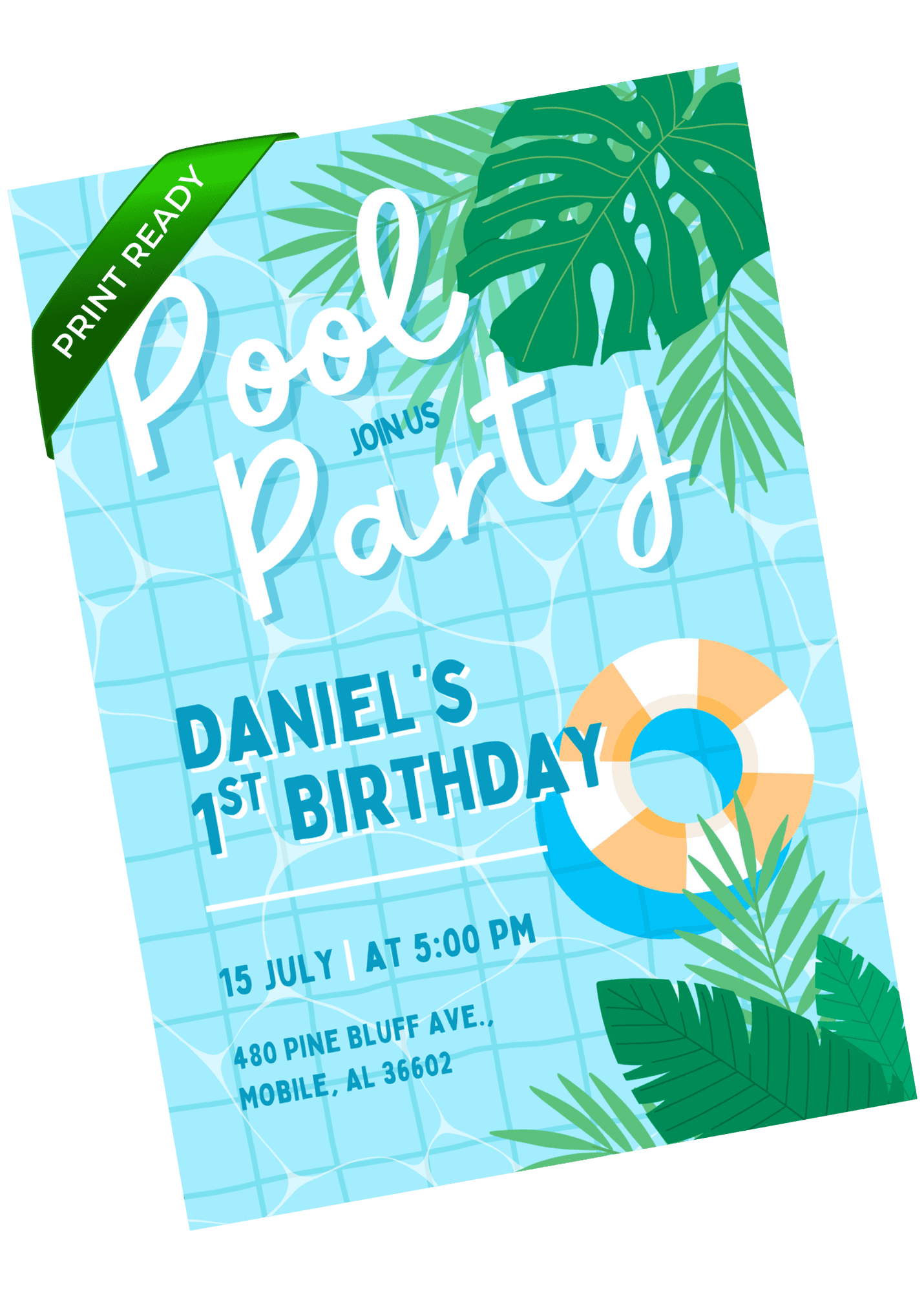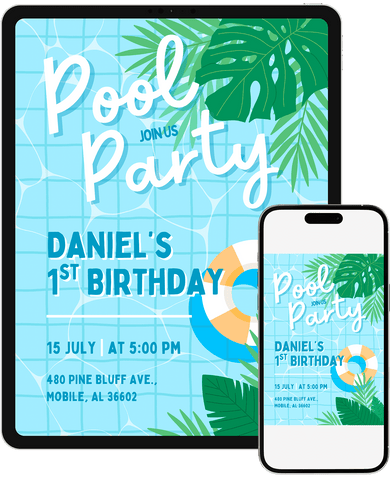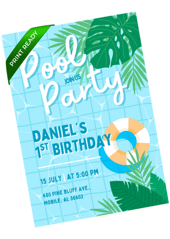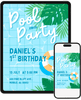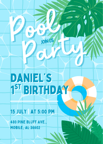 A tropical pool party invitation with bright blues, bold greenery, and a refreshing summer feel. Great for kids who love water play, sunshine, and outdoor fun. Customize in Canva and send an invite that feels energetic, modern, and ready for a warm-weather.