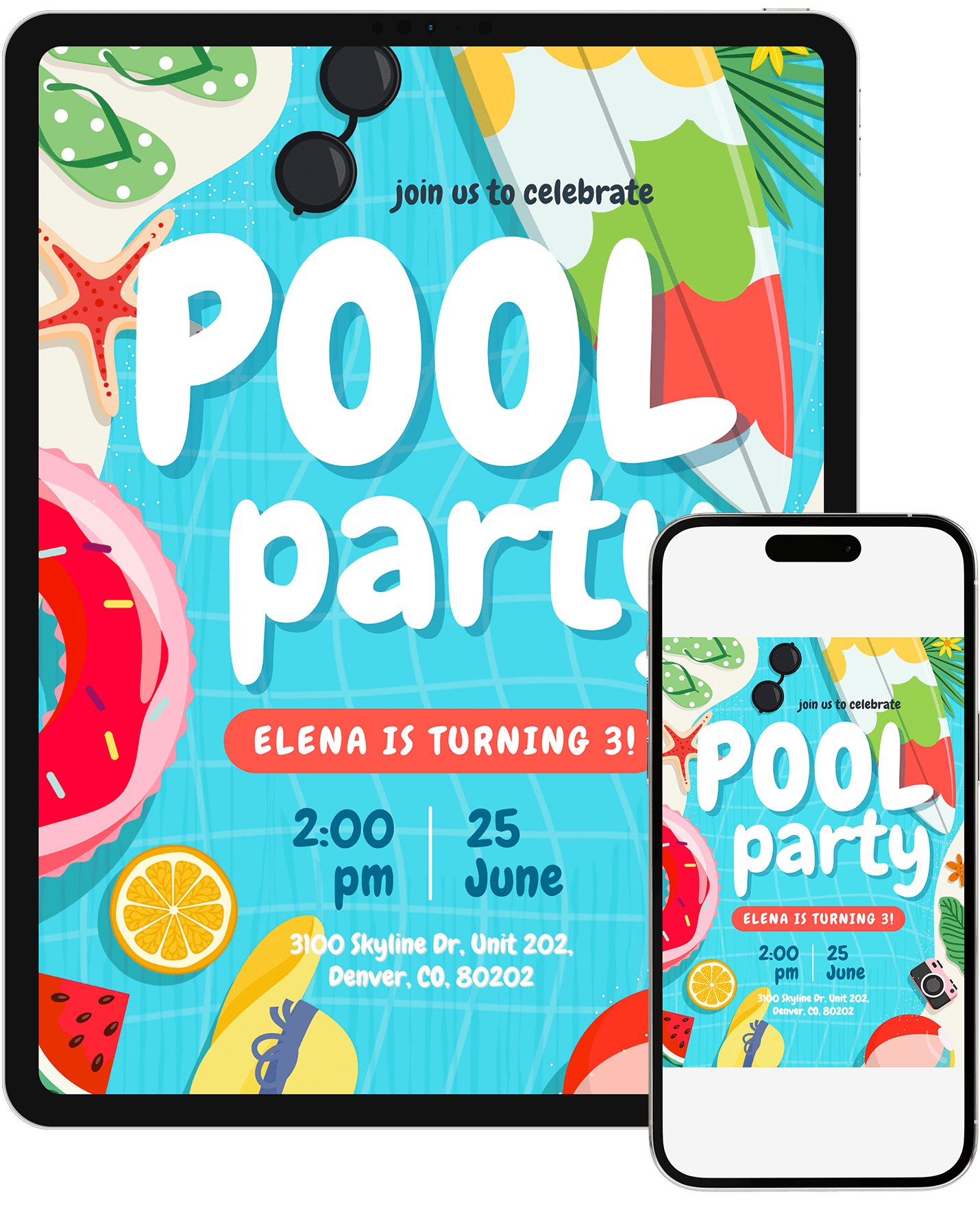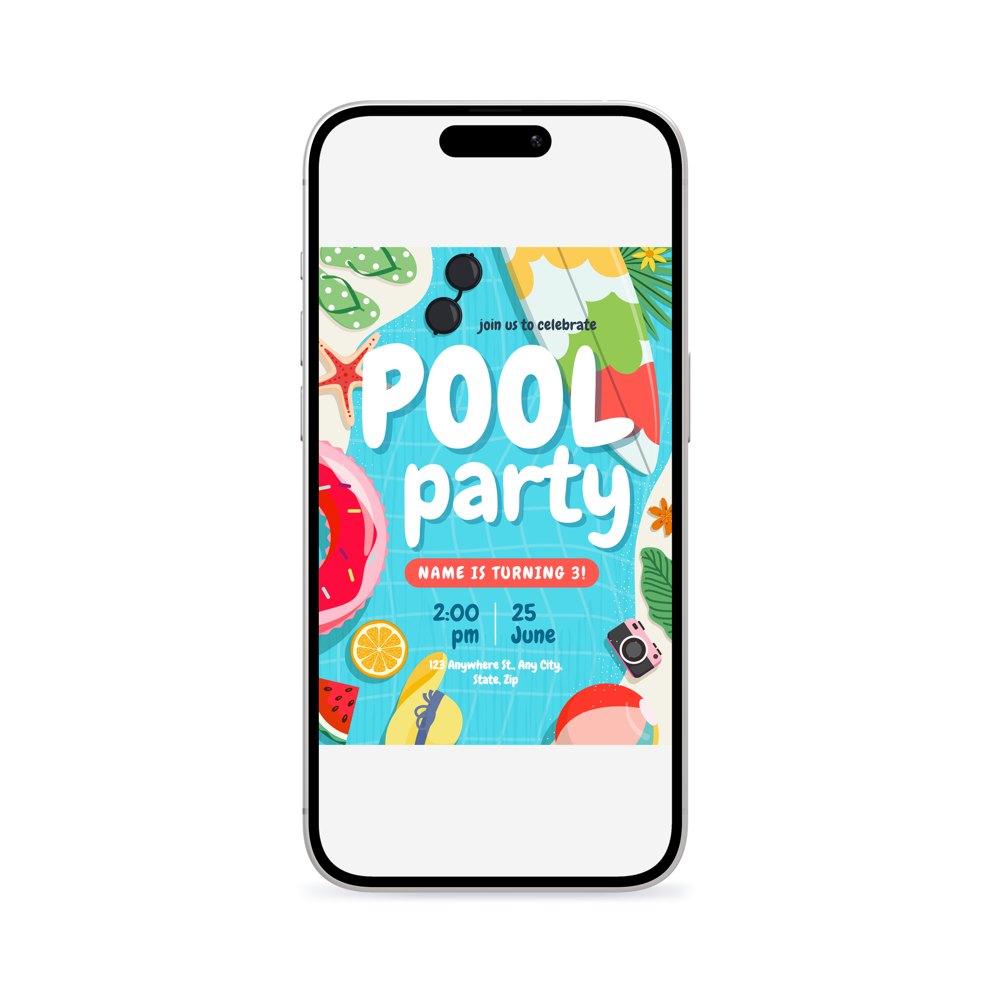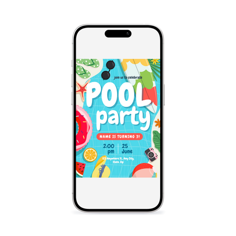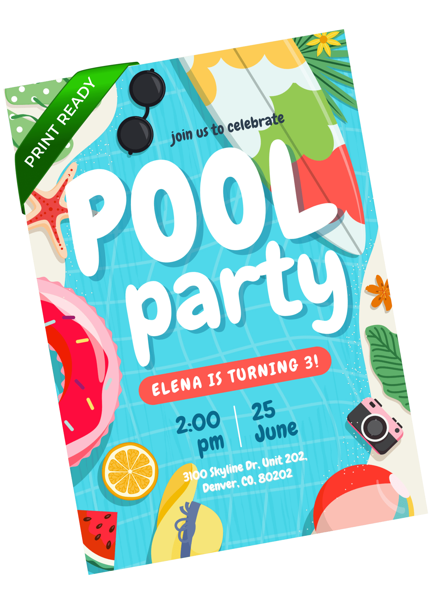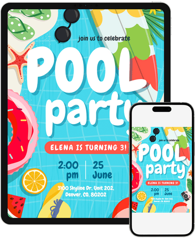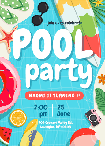 A bright and cheerful pool party invitation filled with colorful floaties, sunny accents, and bold playful lettering. Designed for kids who love water fun and energetic summer gatherings. Edit in Canva and share a lively invite that sets the tone for a joyful poolside celebration.