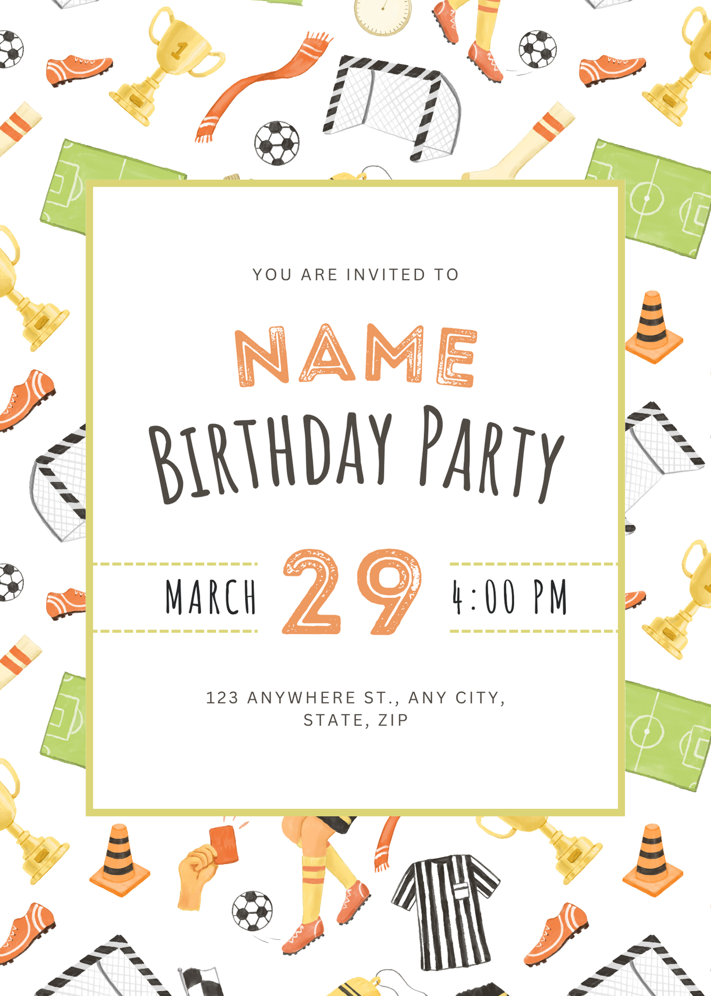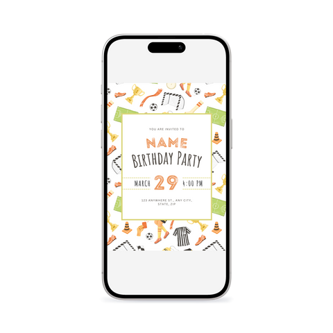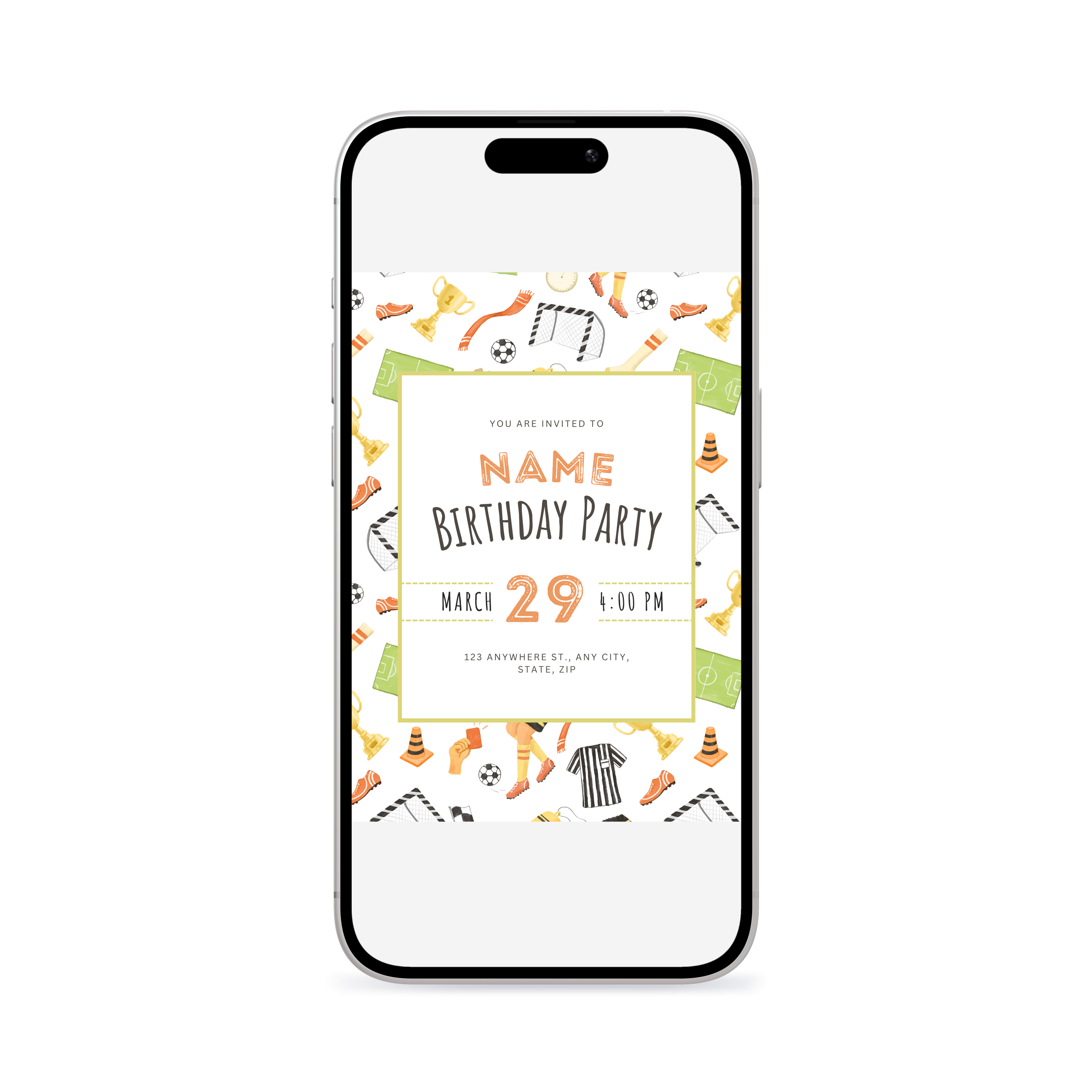 Sleek, modern soccer theme 1st birthday invitation template. Clean design meets contemporary style in this Canva-ready template. Perfect for parents who love minimalist aesthetics with maximum impact.