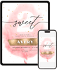 A soft pink birthday invitation with airy pastels, a number graphic, and subtle gold toned accents. Created for little ones who adore sweet, feminine color palettes and gentle modern designs. Edit in Canva for digital delivery or high quality prints.