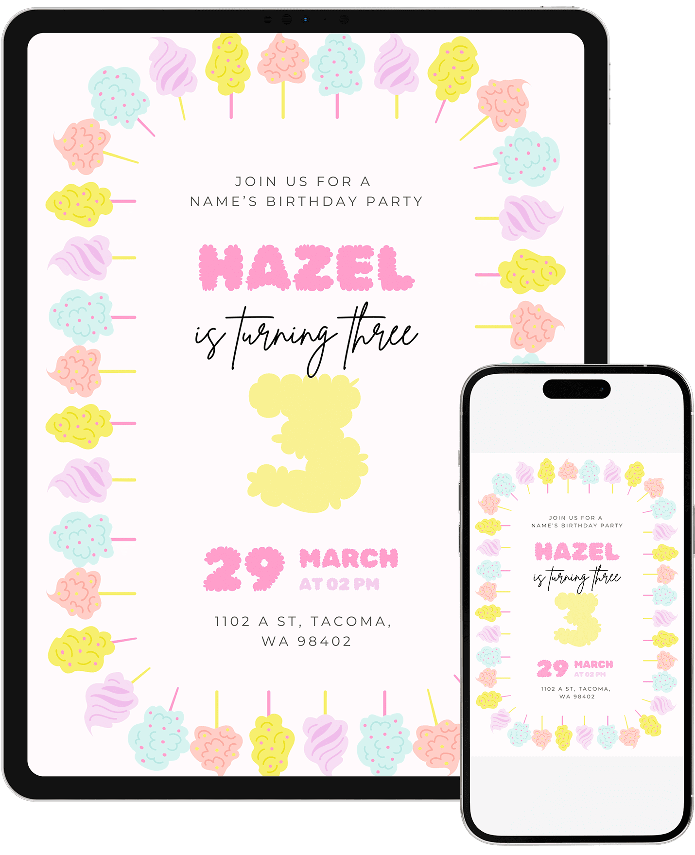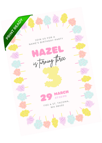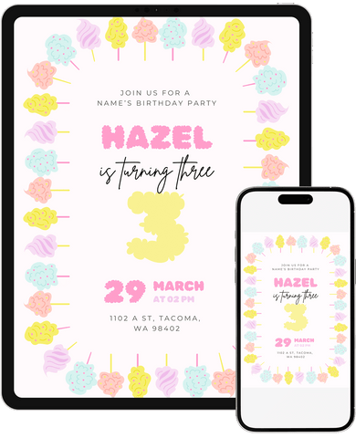 A cheerful cotton candy-inspired birthday invitation with bright pastel accents and a playful rainbow border. A fun match for colorful, upbeat celebrations. Edit in Canva within minutes and share a vibrant invite that sets a joyful tone.