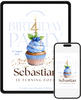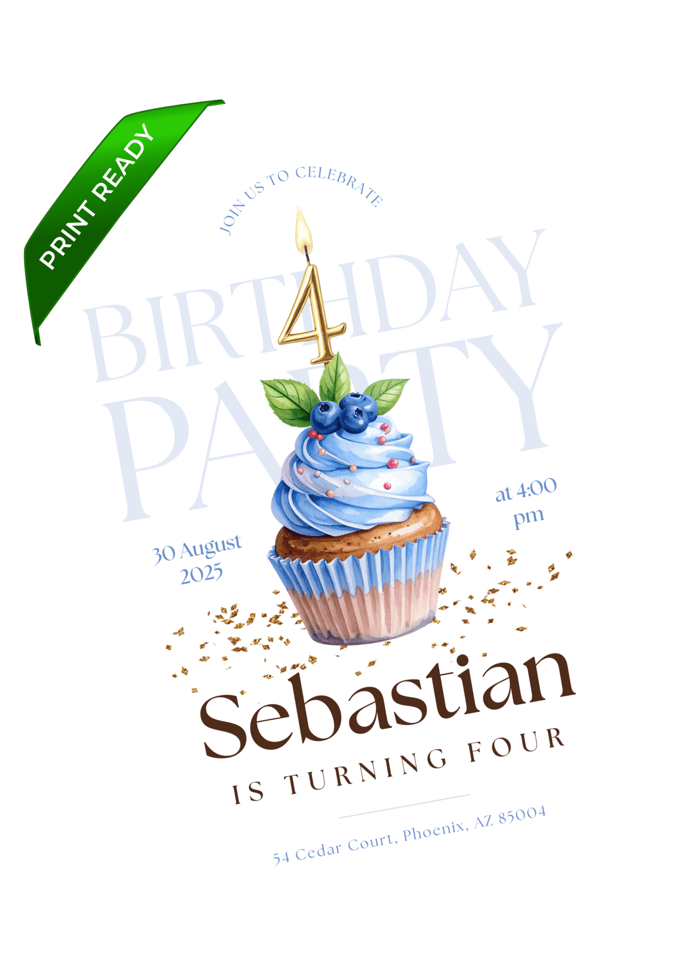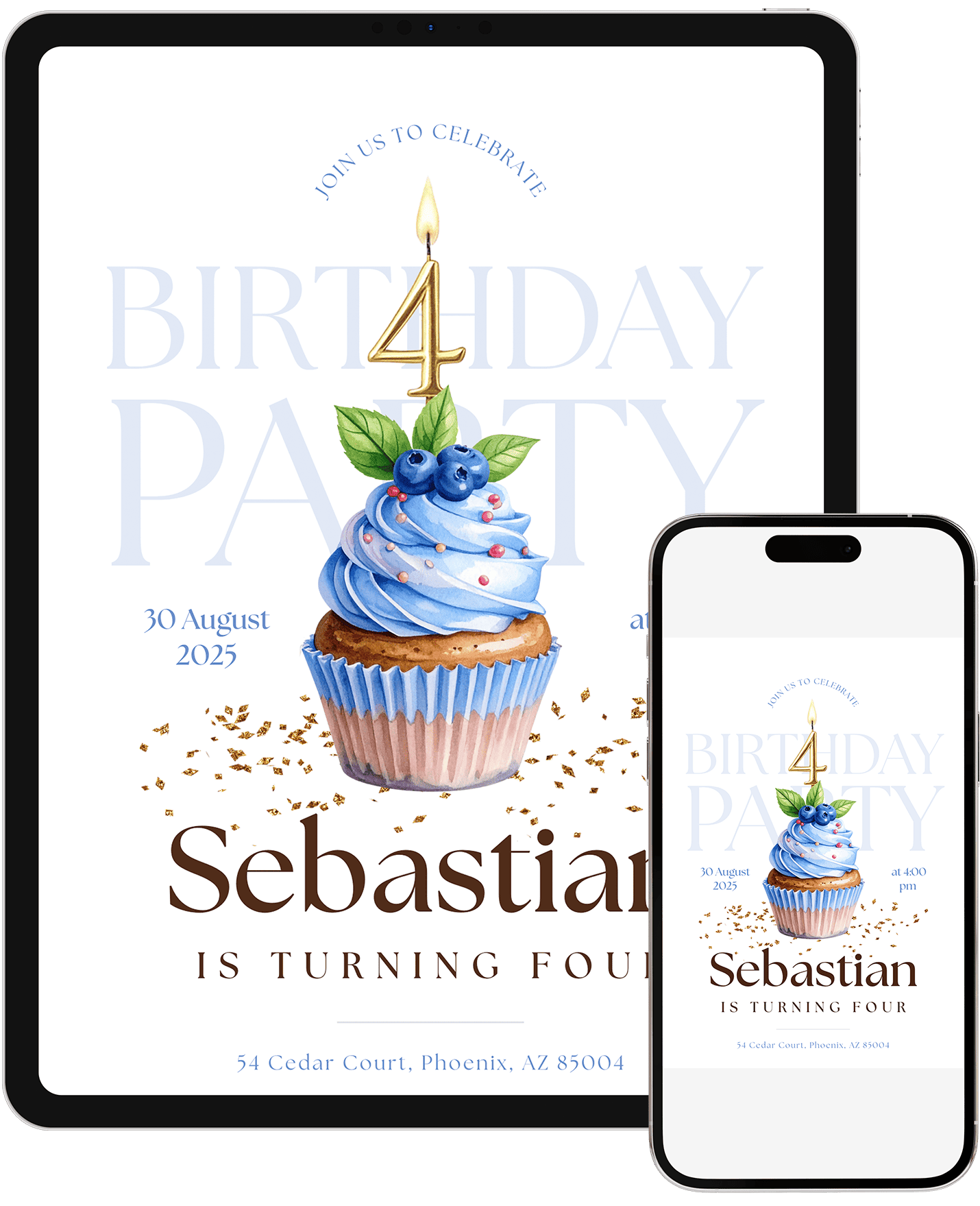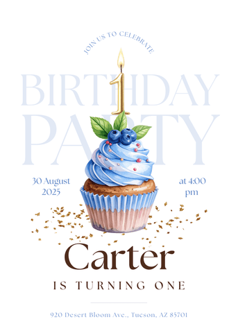 A light blue cupcake invitation with a number candle and subtle gold accents. Ideal for families who want a classic, polished design with gentle color. Edit in Canva and share a refined, celebratory invite that feels clean and fresh.