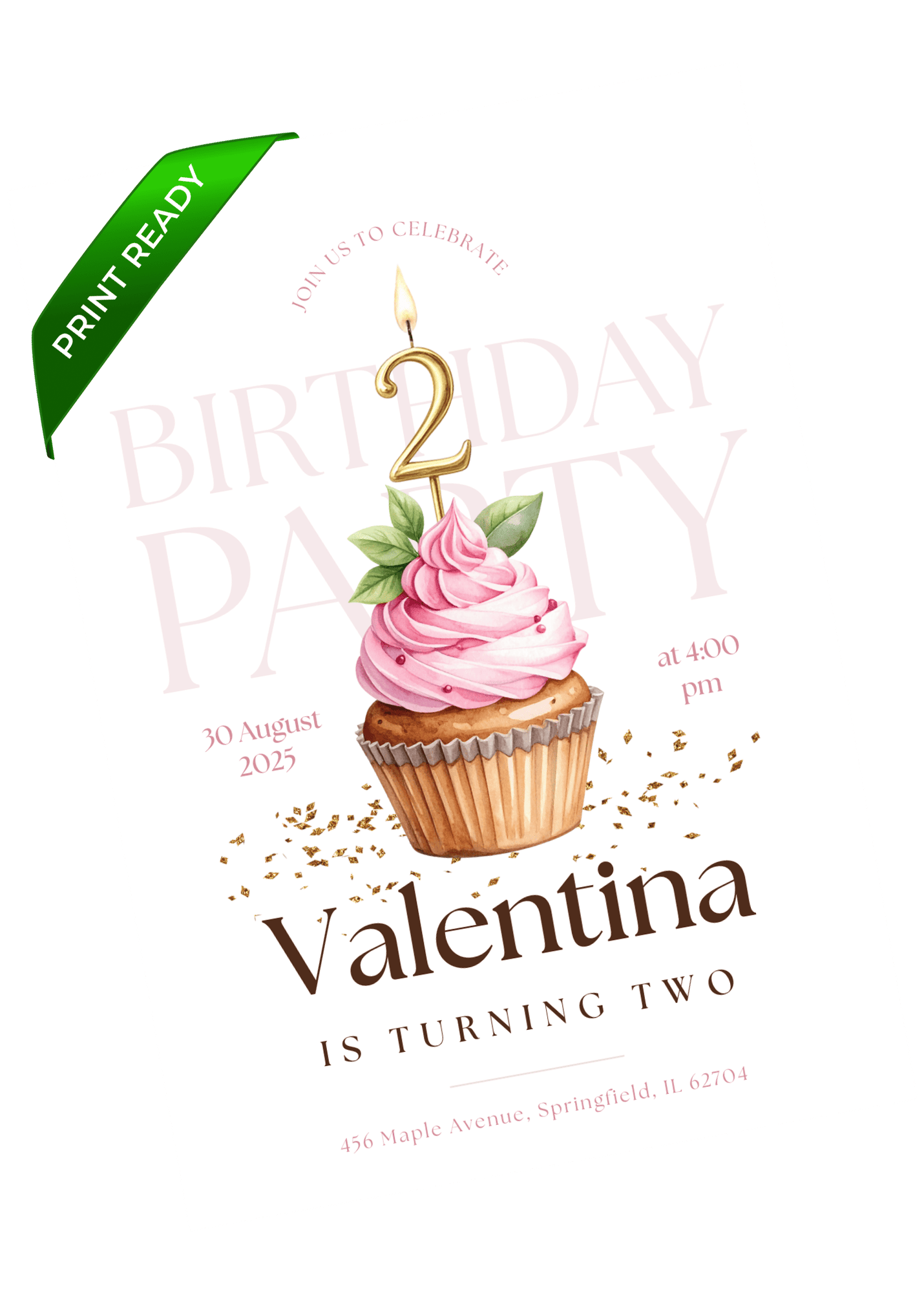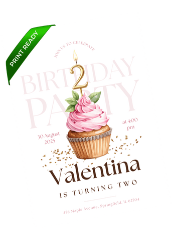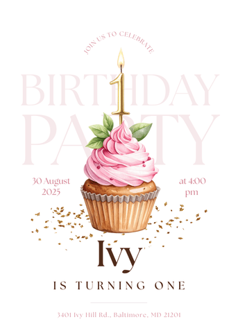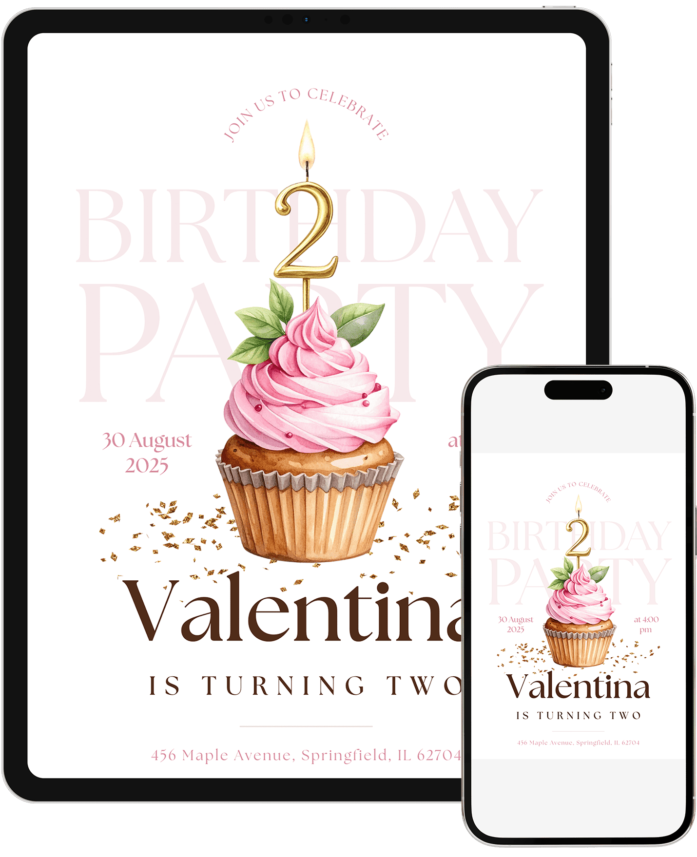 A sweet pink cupcake invitation featuring a number candle and soft pastel accents. Perfect for little ones who love cute birthday themes. Personalize in Canva in minutes and send a cheerful invite that sets a happy tone.