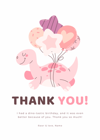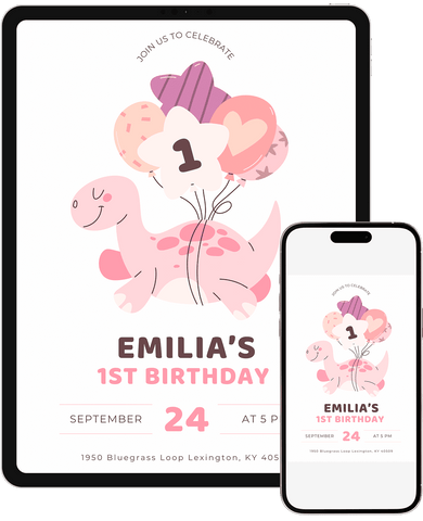 A sweet pink dinosaur birthday invitation featuring a gentle pastel palette and a cute dino wrapped with birthday balloons. Perfect for kids who adore soft colors and whimsical party themes. Edit in Canva within minutes and send a charming digital invite that feels warm and joyful.