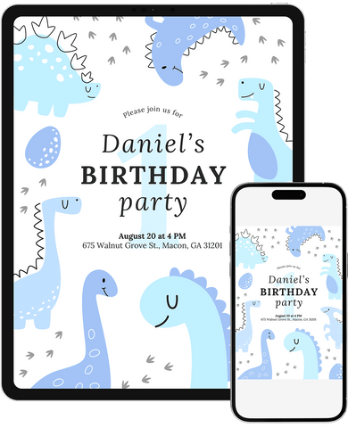 A lively dino-themed birthday invitation filled with cheerful blue dinosaur characters and simple illustrated shapes. Ideal for little explorers who love adventure. Quickly personalize in Canva and send a fun, upbeat invite everyone will love.