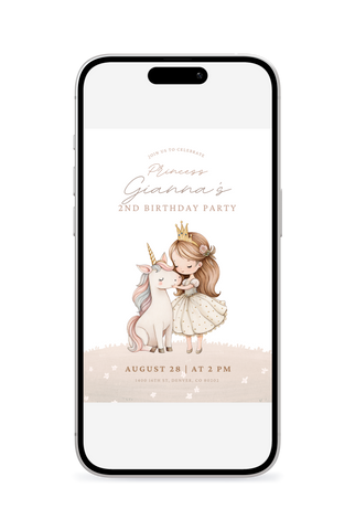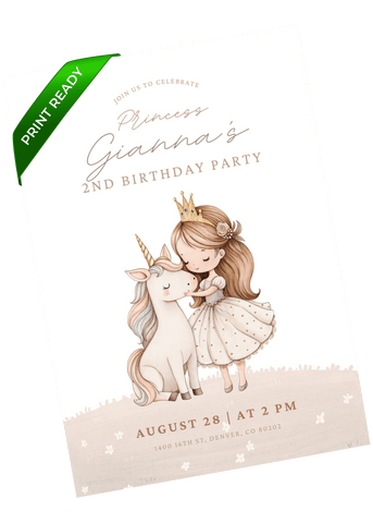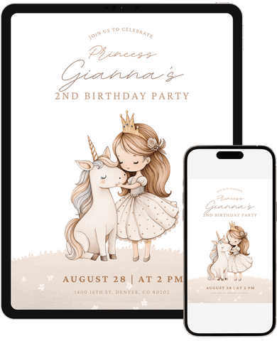 A princess unicorn-themed birthday invitation that sparkles with whimsy and wonder - playful and memorable. Perfect for kids who are into princesses, unicorns, fairy tales, and magical creatures. Personalize it in Canva and share a digital invite that makes the day feel extra special.