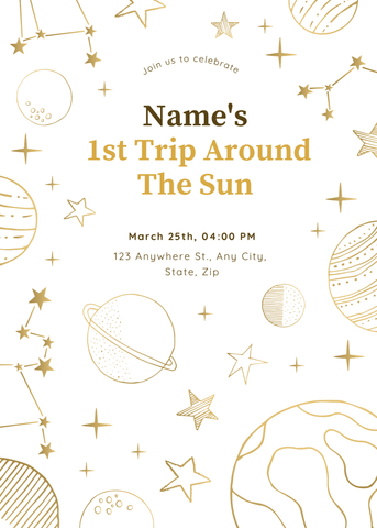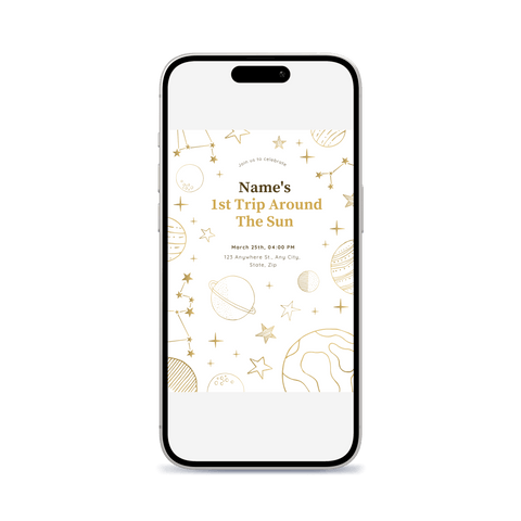 Sleek, modern first trip around the sun theme 1st birthday invitation template. Clean design meets contemporary style in this Canva-ready template. Perfect for parents who love minimalist aesthetics with maximum impact.