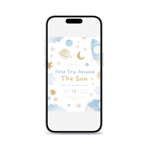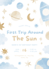 Sleek, modern first trip around the sun theme 1st birthday invitation template. Clean design meets contemporary style in this Canva-ready template. Perfect for parents who love minimalist aesthetics with maximum impact.