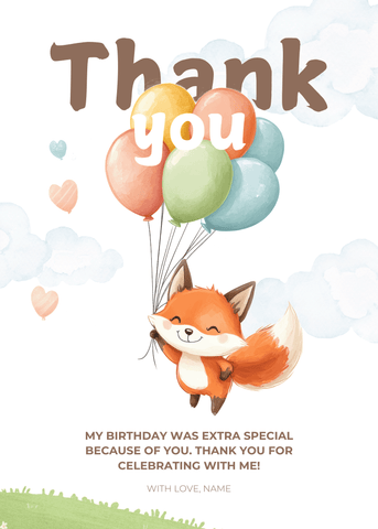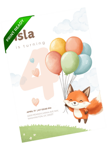 This playful birthday invitation highlights an adventurous fox with bright balloons and a light, friendly color palette. Perfect for kids who enjoy animal themes with a fun outdoor feel. Edit instantly in Canva to share a lively party invite.