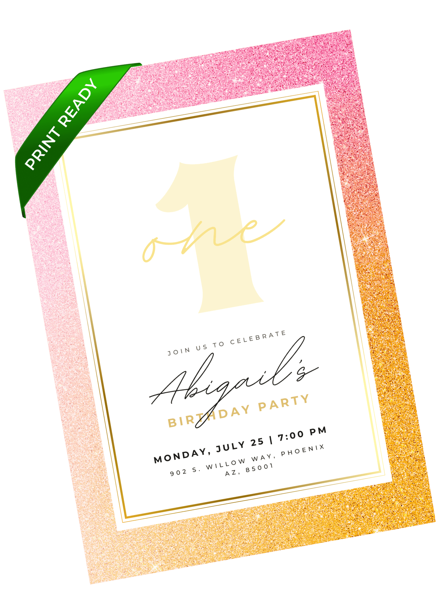 A soft pink glitter invitation with warm gold tones and a minimal layout. Ideal for families who want a simple, celebratory design with gentle sparkle. Customize in Canva and send an inviting, polished birthday card.