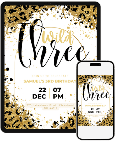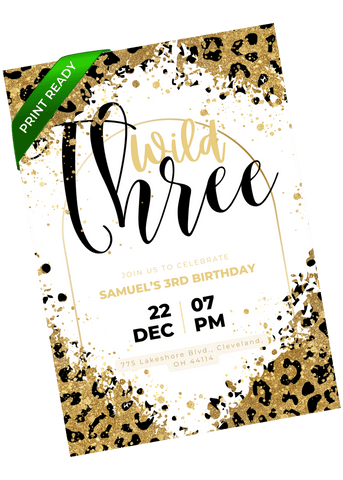A stylish birthday invitation with bold gold spots and a modern “Wild One” feature. Perfect for parents looking for something chic with a playful twist. Personalize in Canva and create a fun, high-style invitation for a memorable celebration.