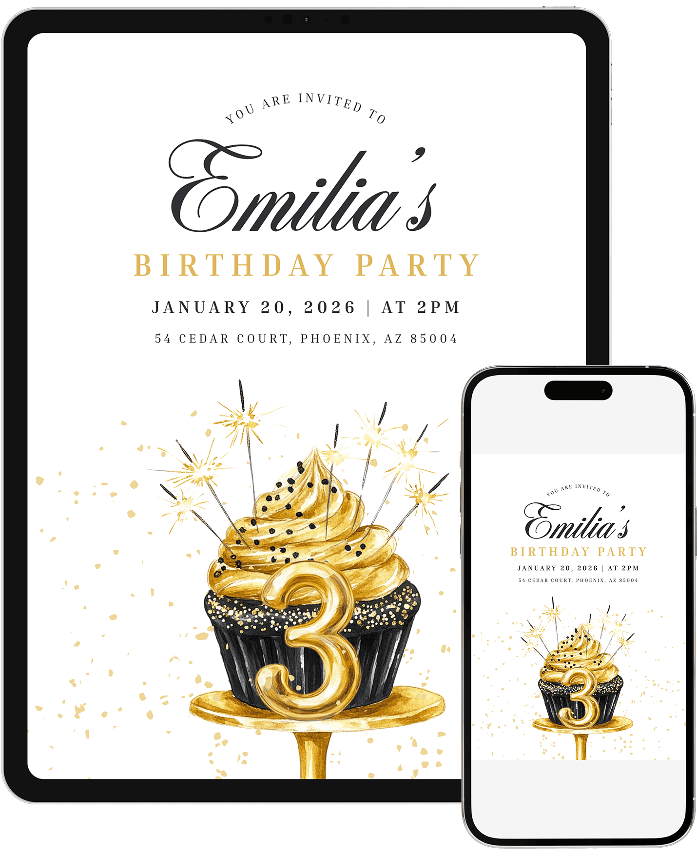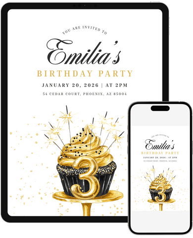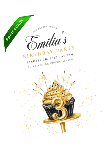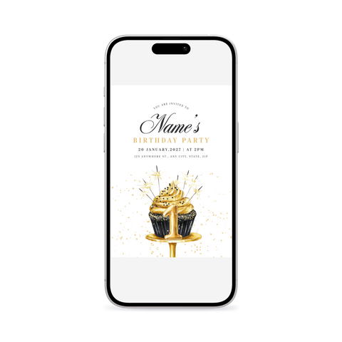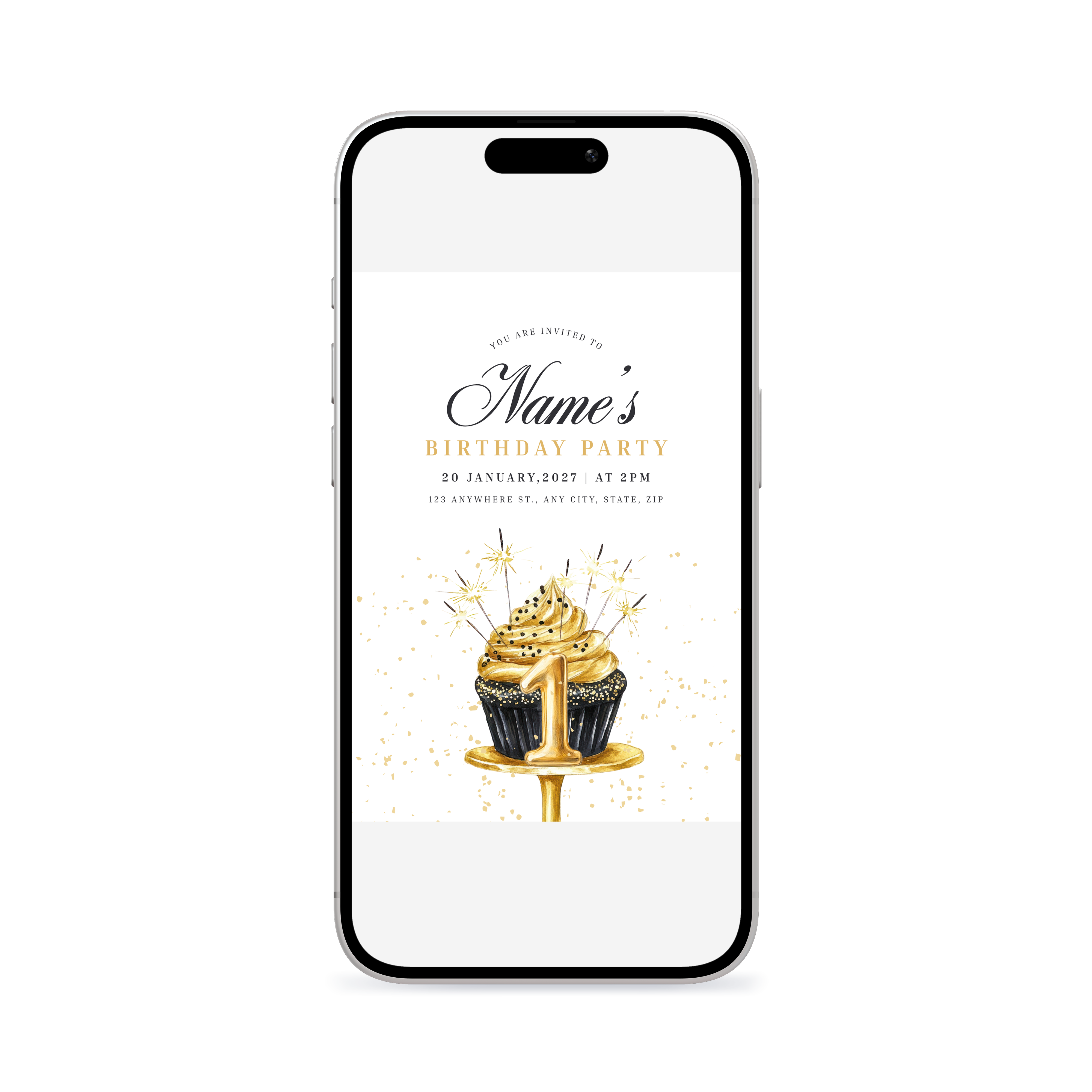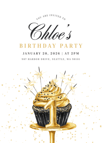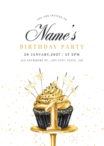 A modern and elegant birthday invitation showcasing a gold cupcake with sparkling accents. Perfect for families wanting a celebratory design with a refined touch. Edit quickly in Canva and send a polished invite that feels festive and stylish.