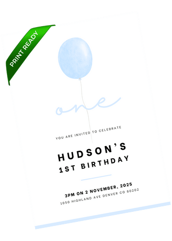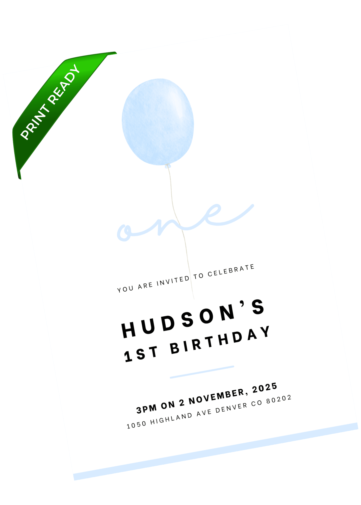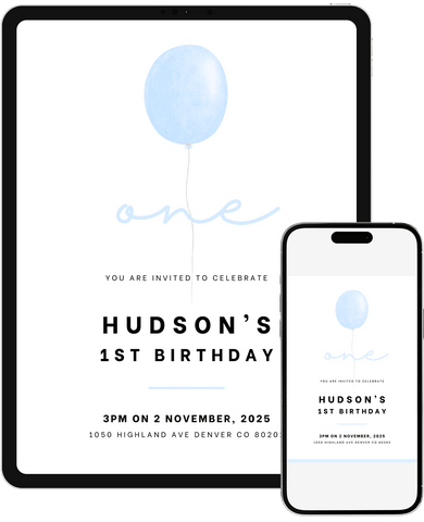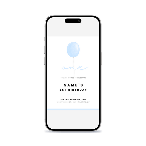 A simple and stylish blue balloon invitation that keeps the focus on clean design and soft color. Great for a child who loves a calm, minimal theme. Customize in Canva and send a timeless digital invite that feels light and effortless.