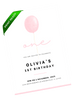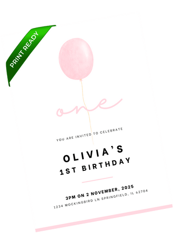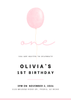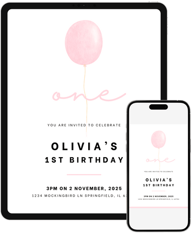 A minimal pink balloon invitation featuring soft color and a clean, open layout. Great for parents who prefer a simple, understated design for a first birthday. Edit in Canva and share a classic invite that feels calm, modern, and effortless.