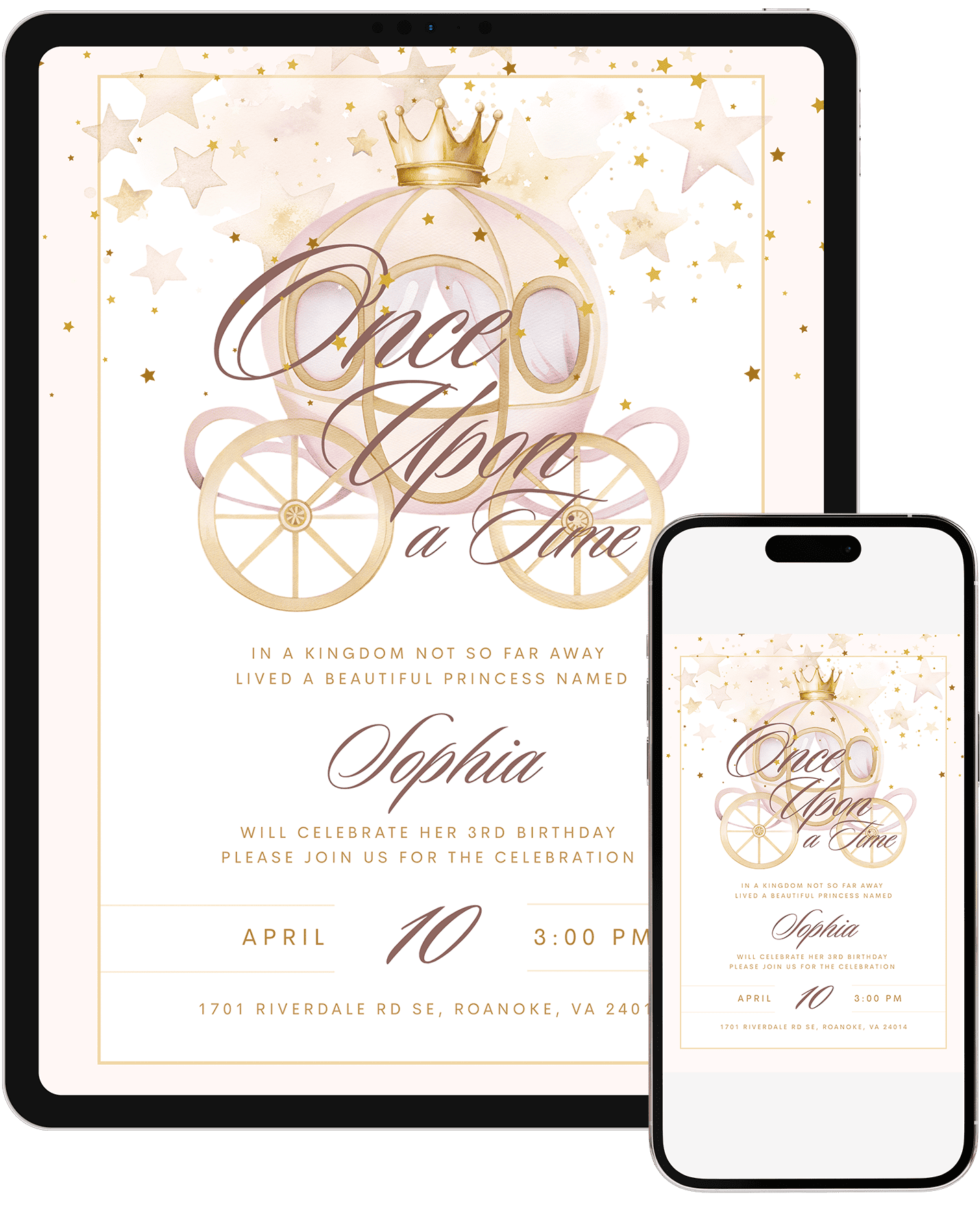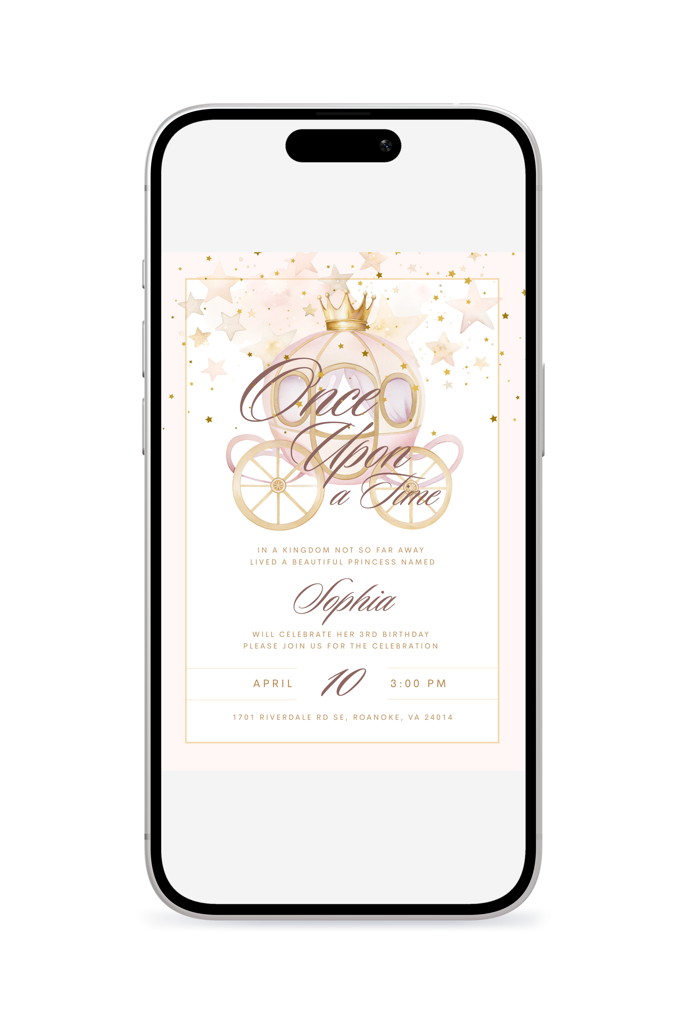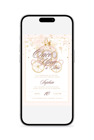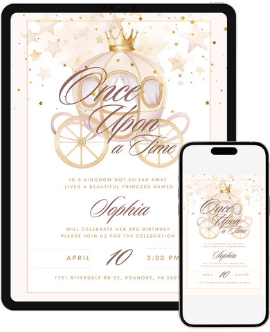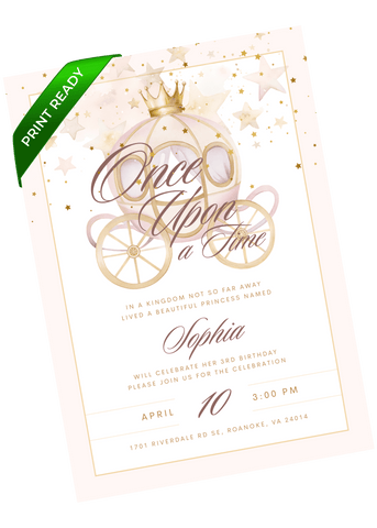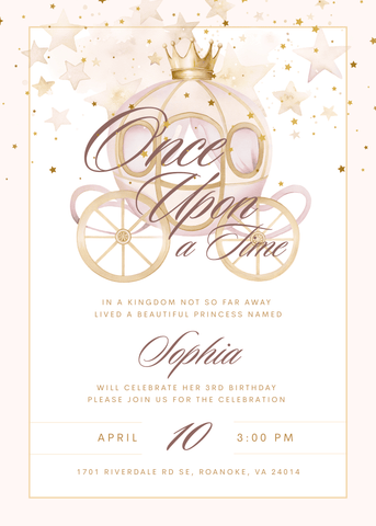 This festive princess carriage birthday invitation feels like a royal celebration. Made for kids who enjoy princesses, fairy tales, and magical kingdoms. Easily customize in Canva and instantly send a digital invite that makes them feel like royalty.