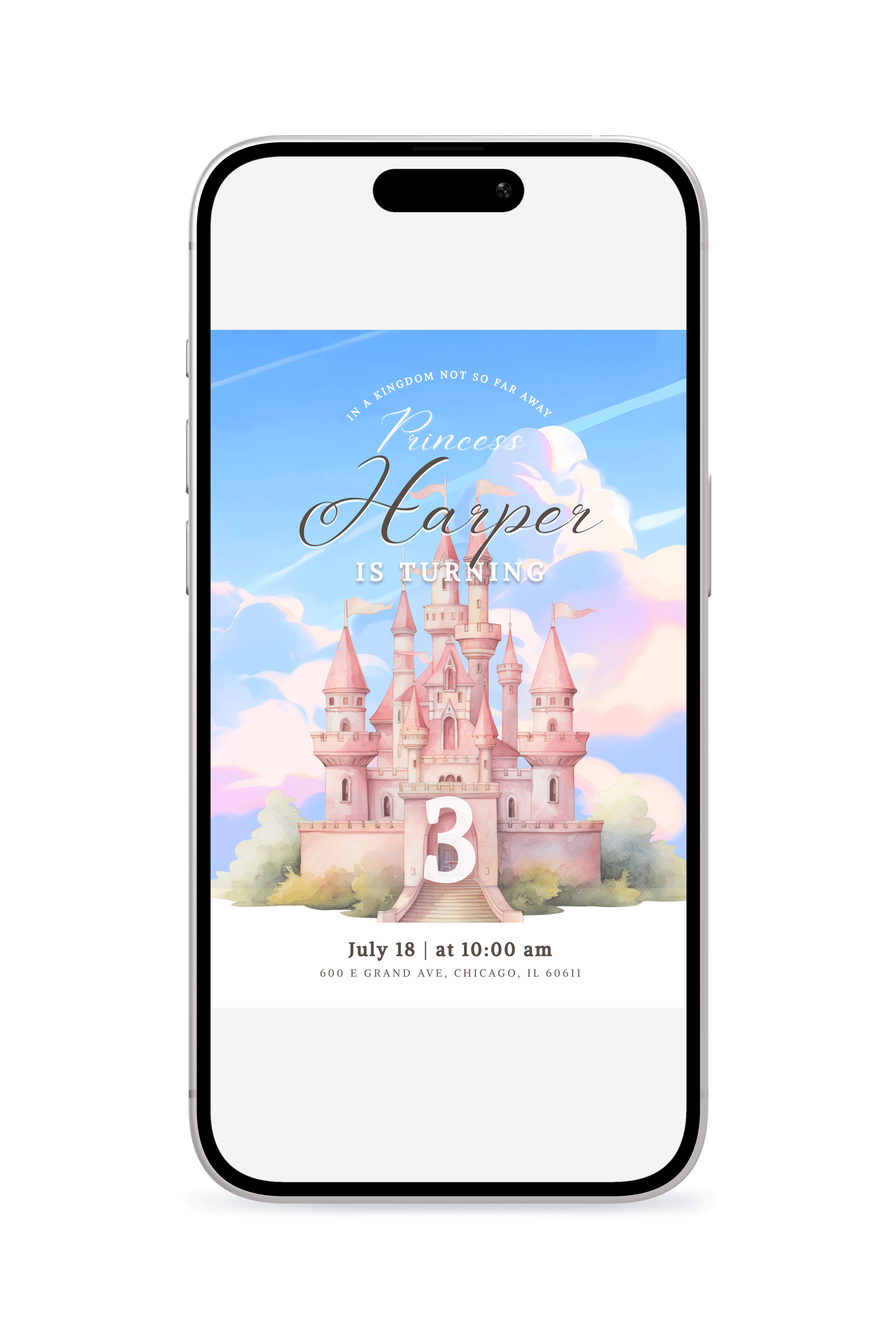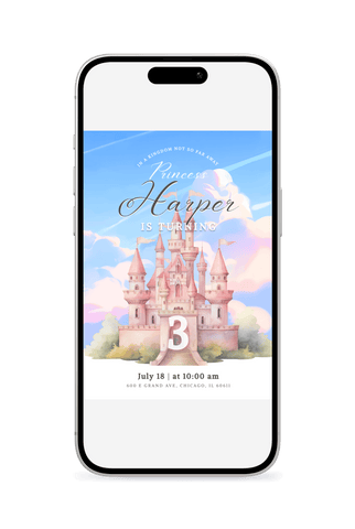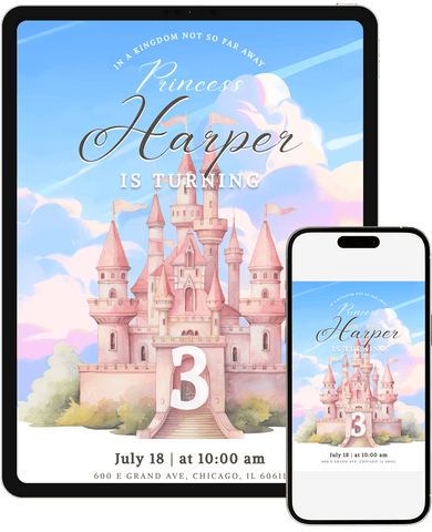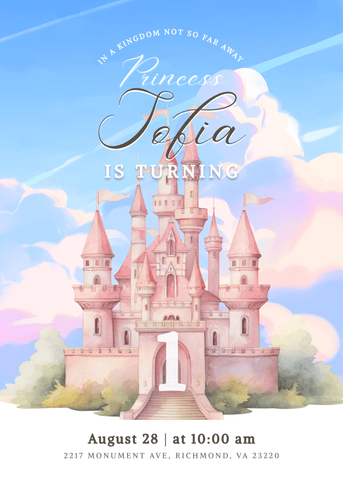 Celebrate with a exciting princess castle-themed invitation that feels like a royal celebration. A fun choice for fans of fairytales, princesses, and magical castles. Edit in Canva to create a digital invite that makes them feel like royalty.