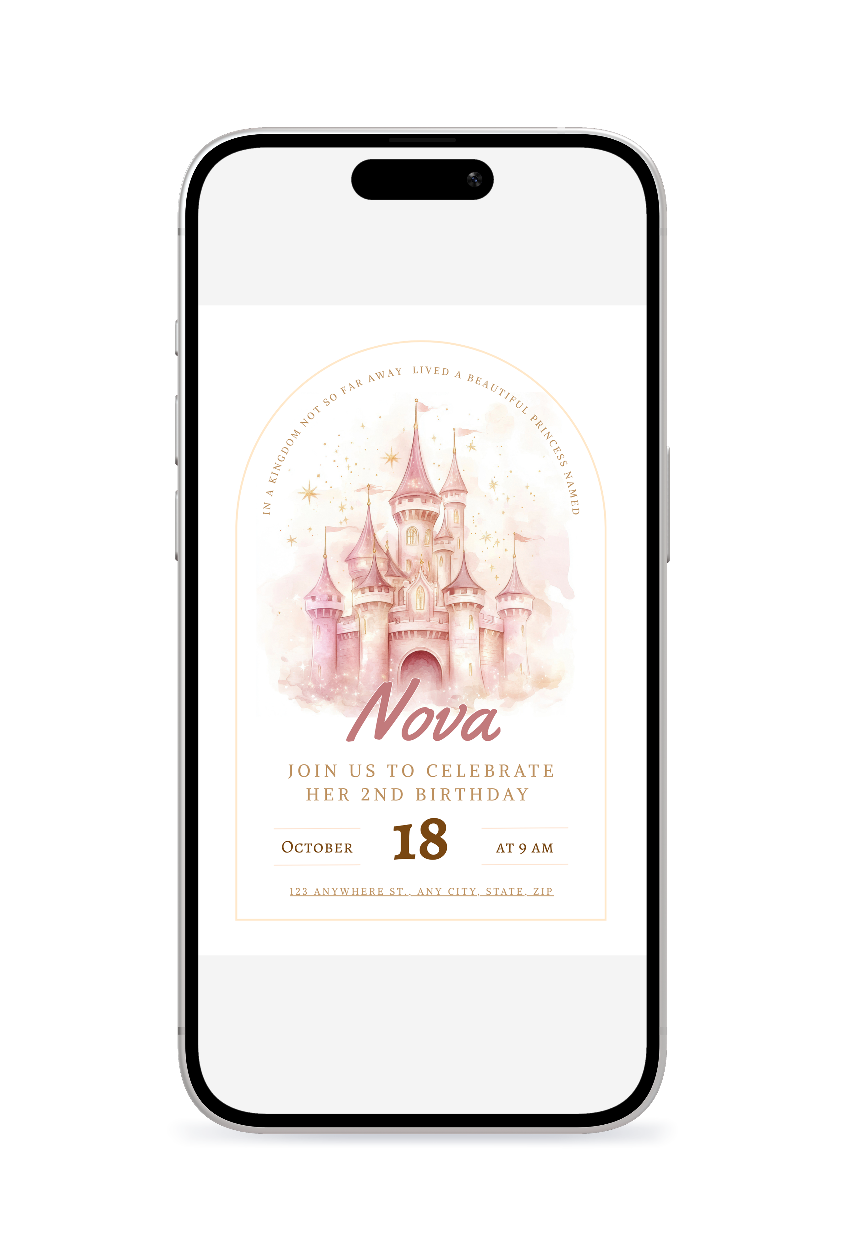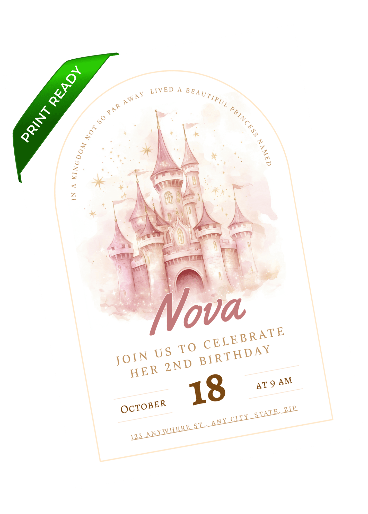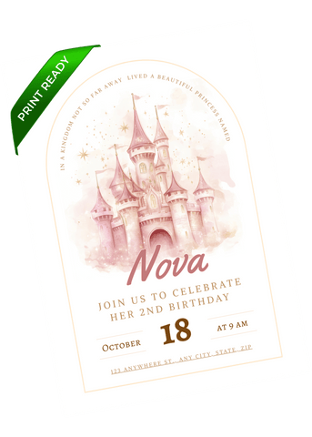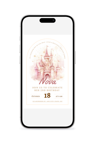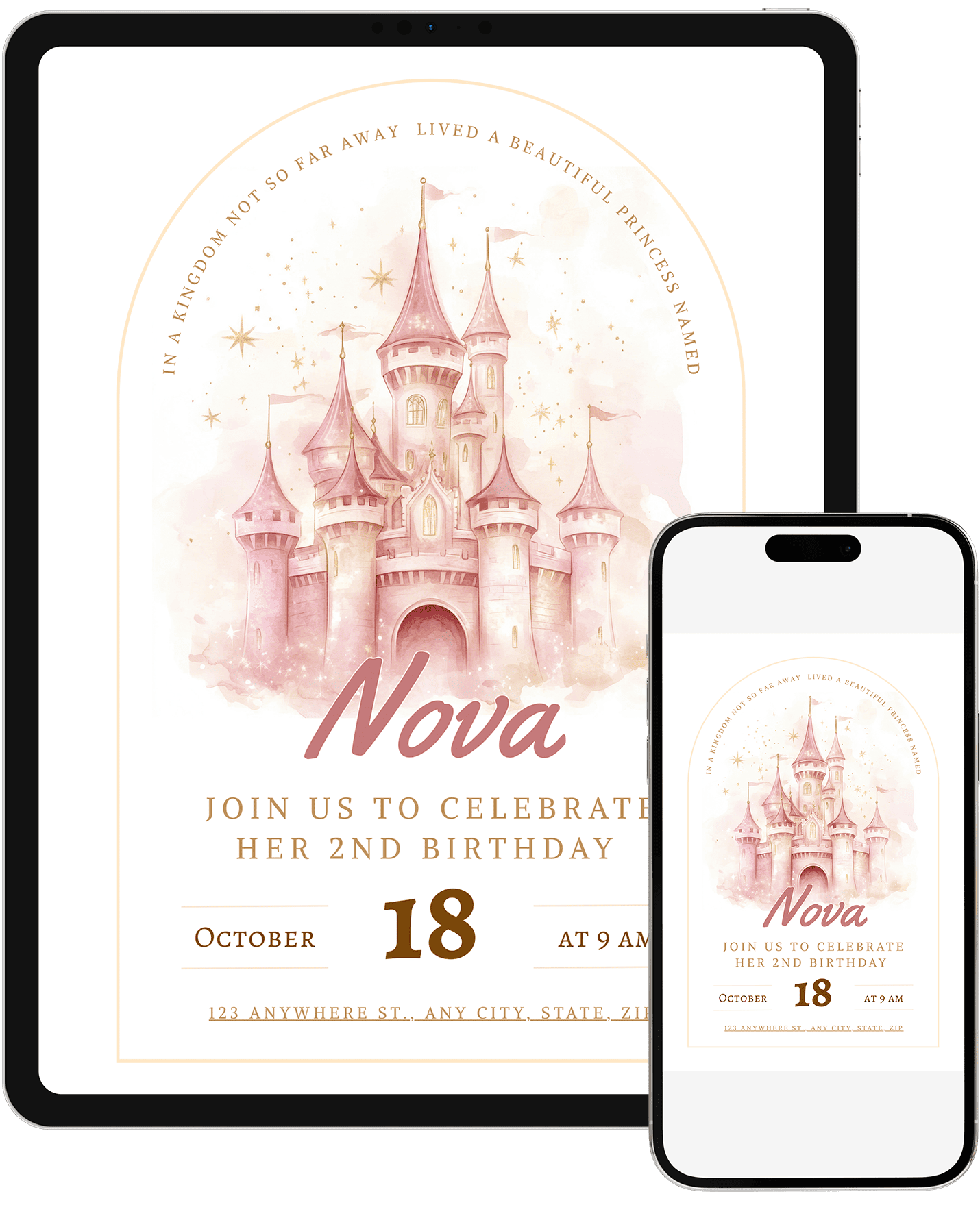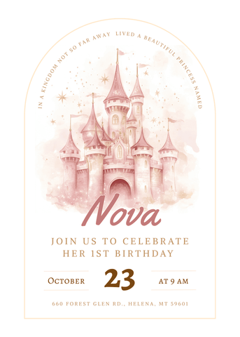 Celebrate with a fun princess castle-themed invitation that feels like a royal celebration. Ideal for little fans of princesses, fairy tales, and castles. Easily customize in Canva and instantly send a digital invite that makes them feel like royalty.