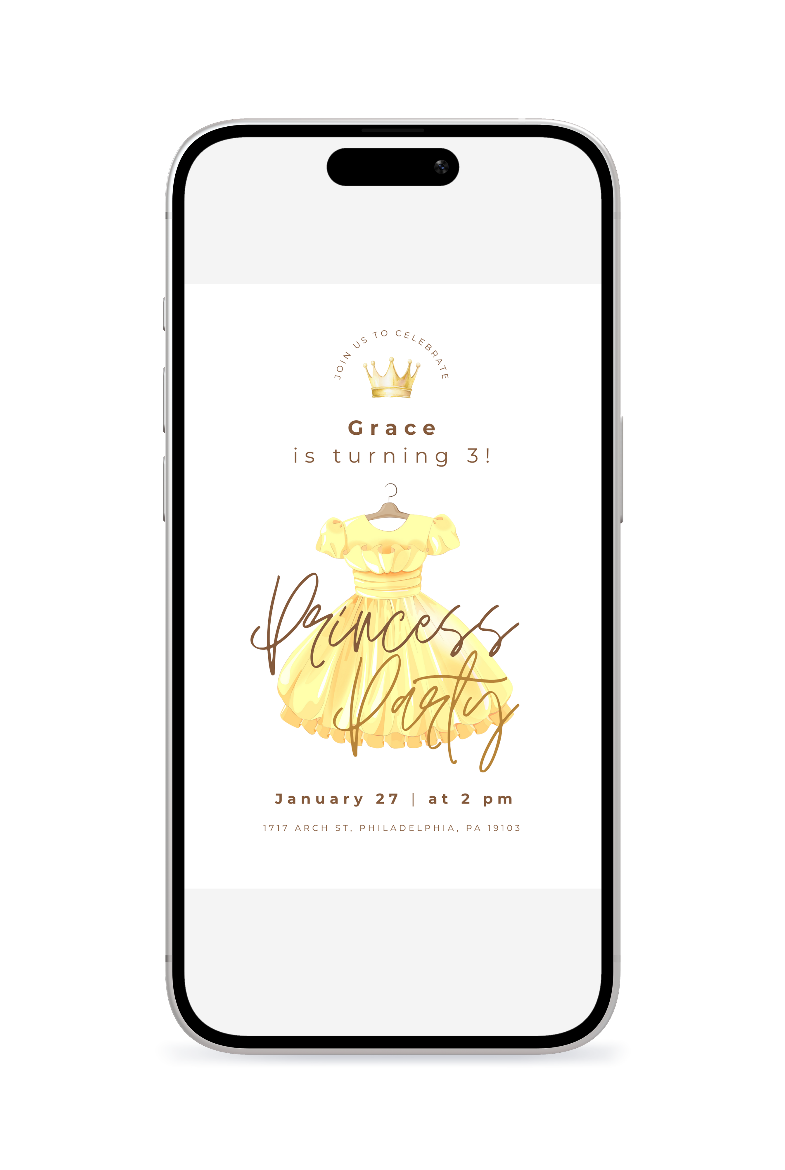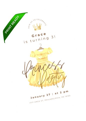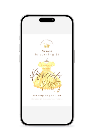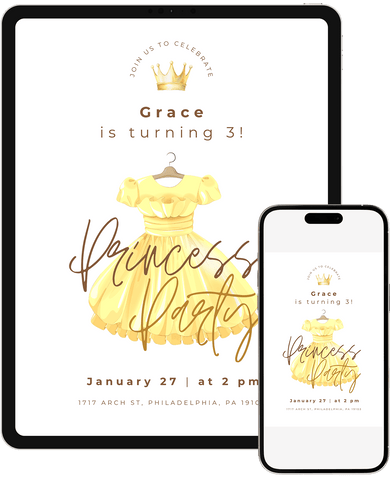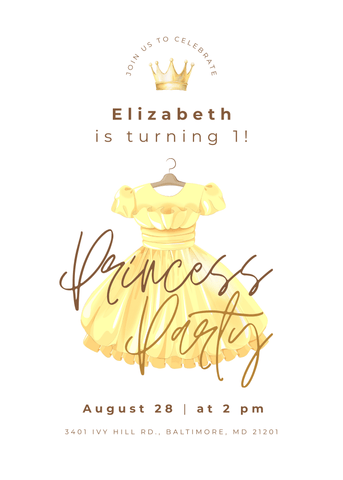 A lively princess dress-themed birthday invitation that feels like a royal celebration. Great for little ones who love princesses, crowns, dresses, and being royalty. Easily customize in Canva and instantly send a digital invite that makes them feel like royalty.