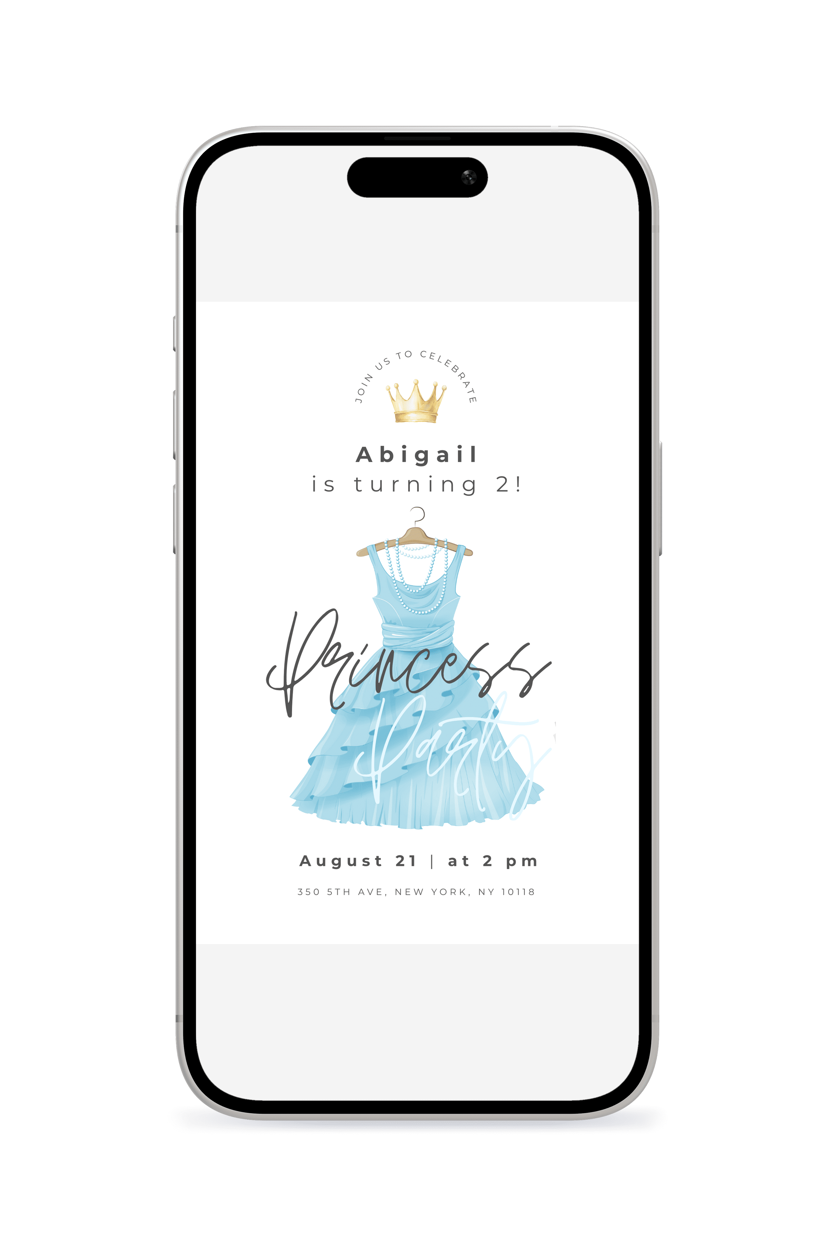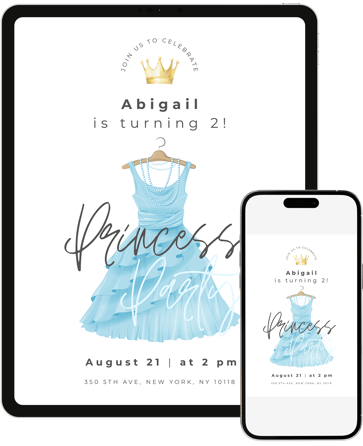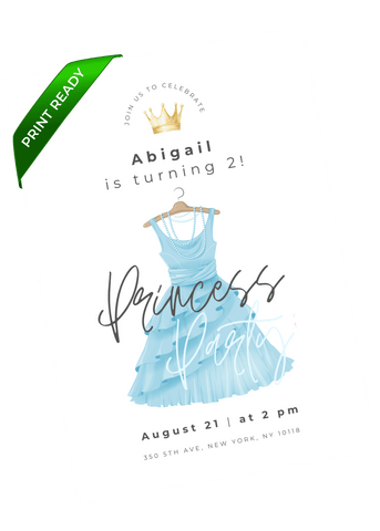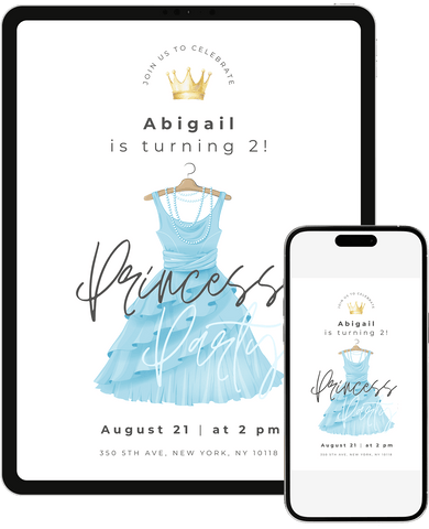 A lively princess dress-themed birthday invitation that feels like a royal celebration. Great for little ones who love princesses, crowns, dresses, and being royalty. Easily customize in Canva and instantly send a digital invite that makes them feel like royalty.