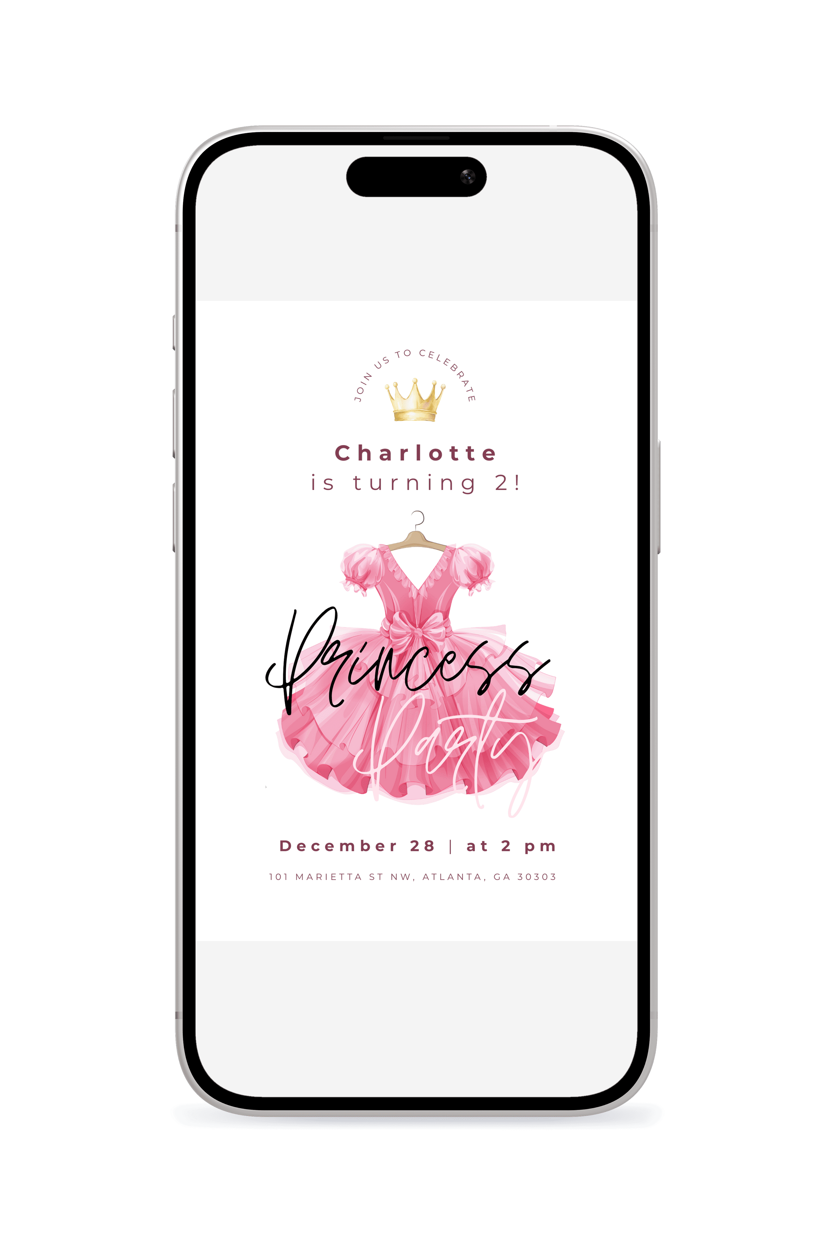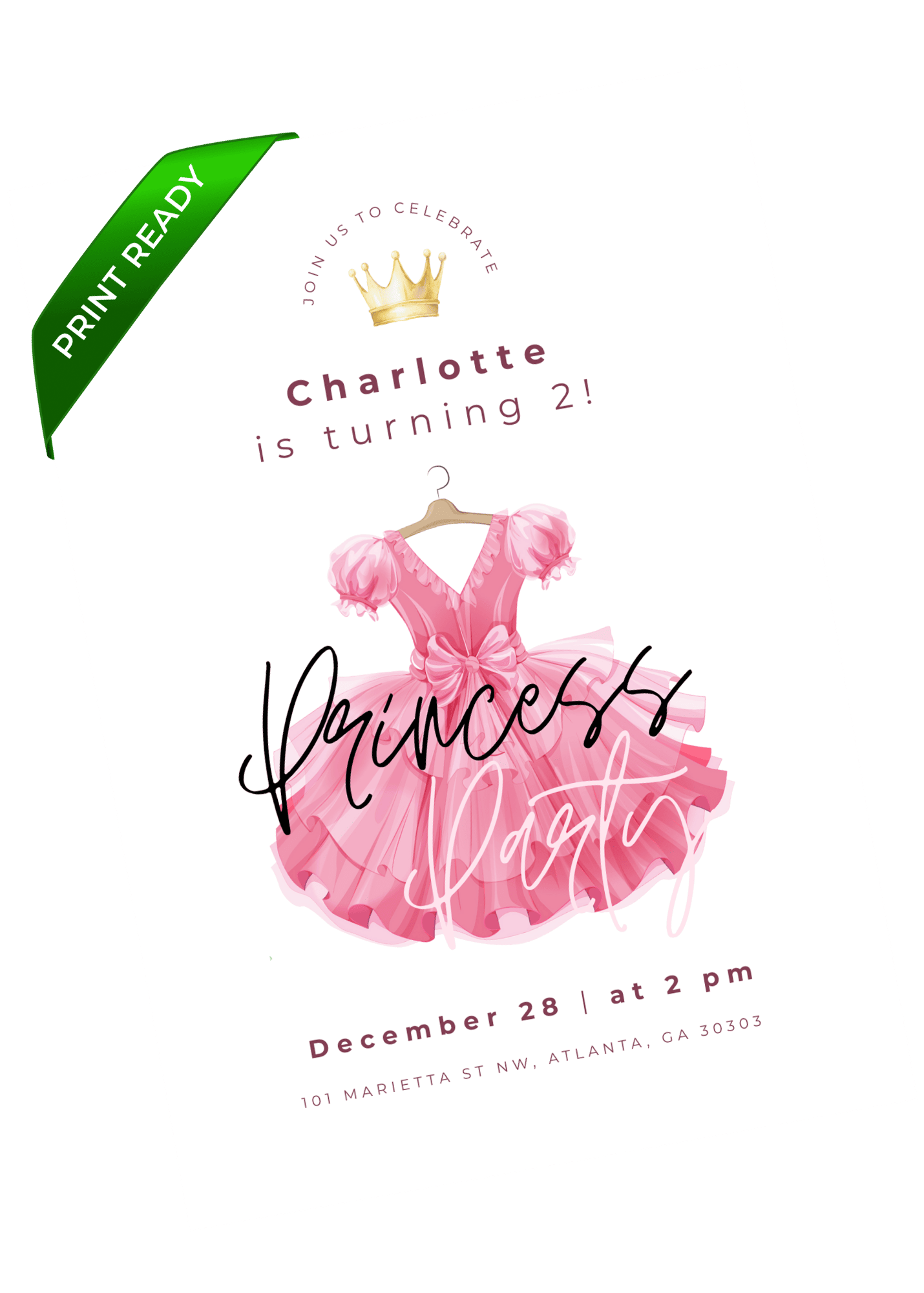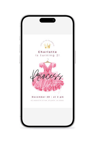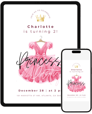 A lively princess dress-themed birthday invitation that feels like a royal celebration. Great for little ones who love princesses, crowns, dresses, and being royalty. Easily customize in Canva and instantly send a digital invite that makes them feel like royalty.