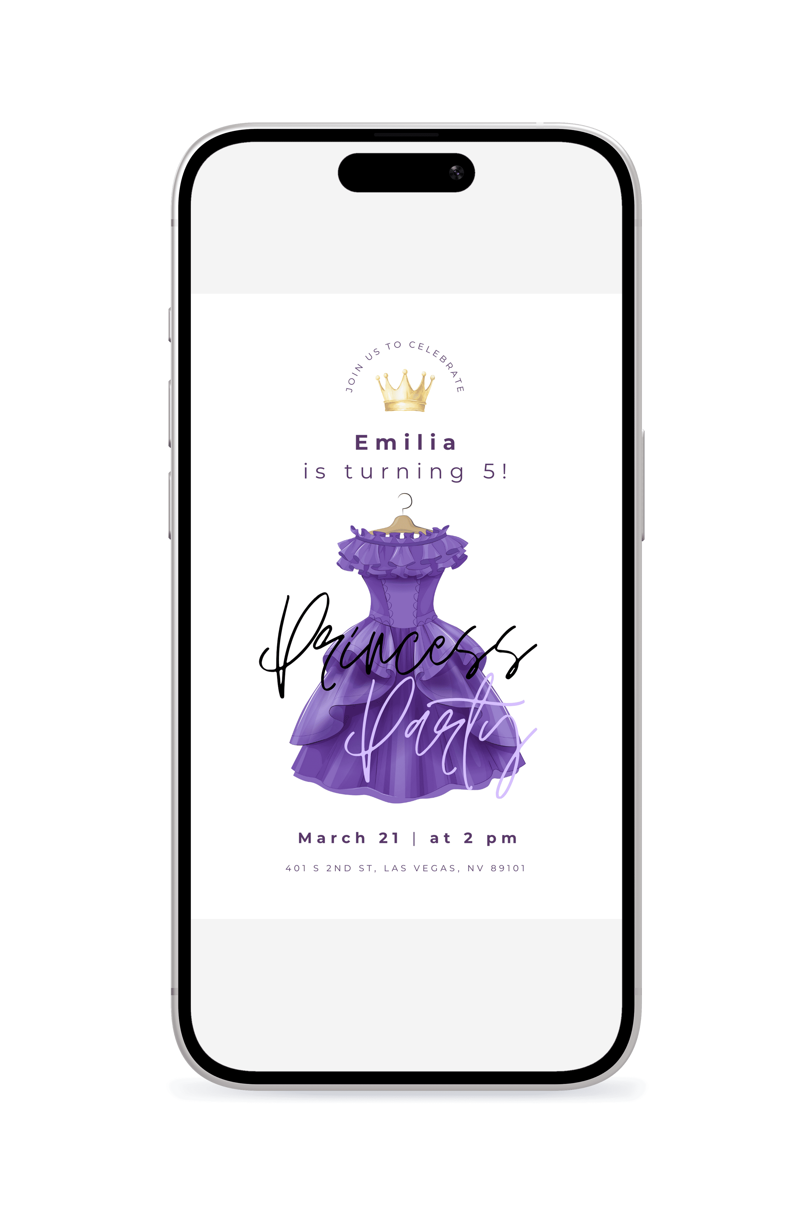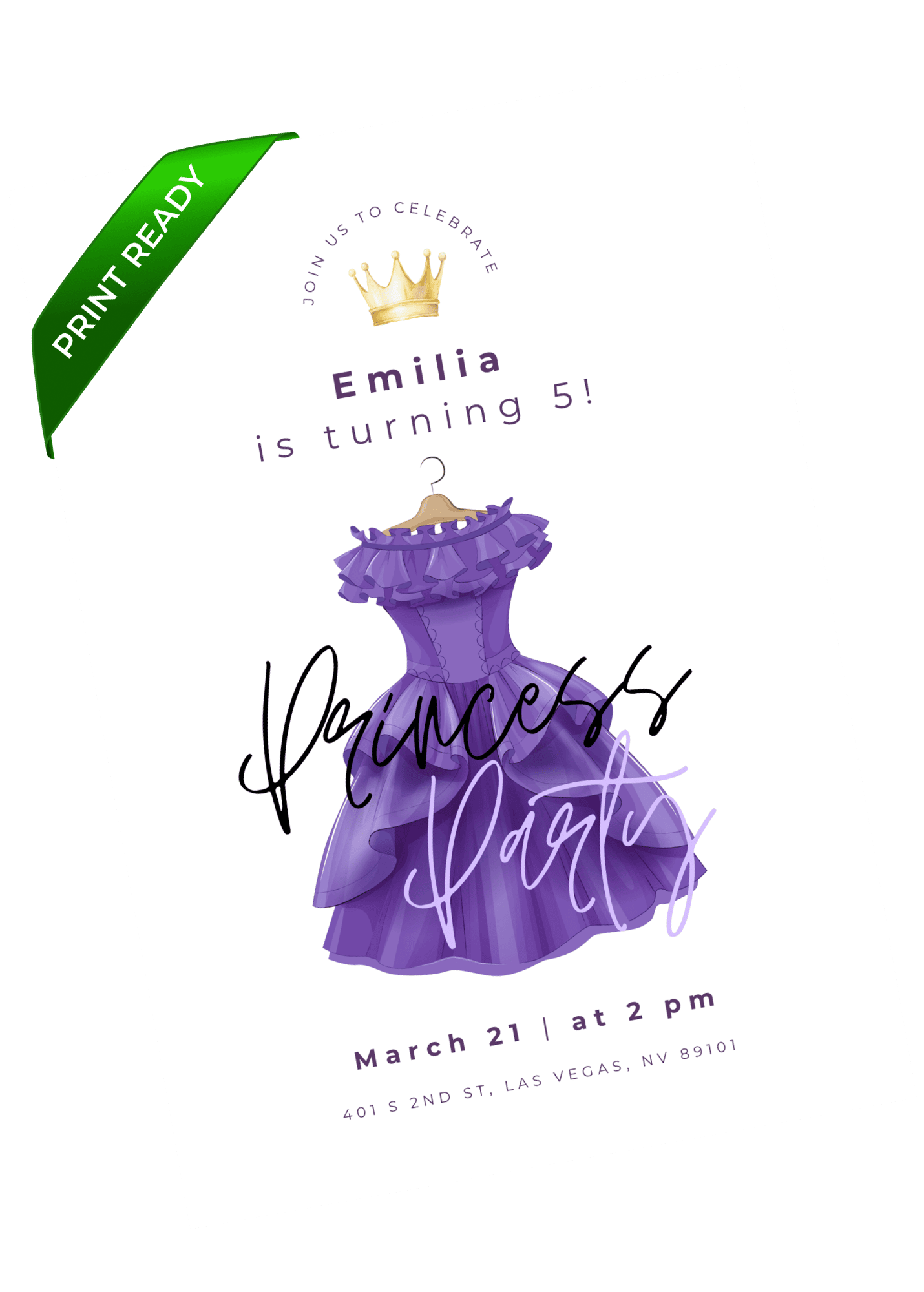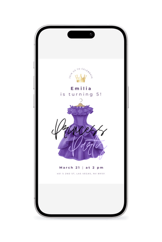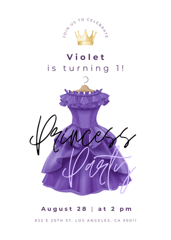 A lively princess dress-themed birthday invitation that feels like a royal celebration. Great for little ones who love princesses, crowns, dresses, and being royalty. Easily customize in Canva and instantly send a digital invite that makes them feel like royalty.