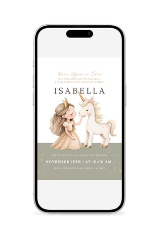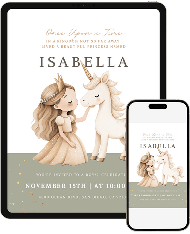 A fun princess unicorn-themed birthday invitation that sparkles with whimsy and wonder. Great for little ones who love princesses, unicorns, fairy tales, and magical creatures. Customize in Canva and send a digital invitation that makes the day feel extra special.