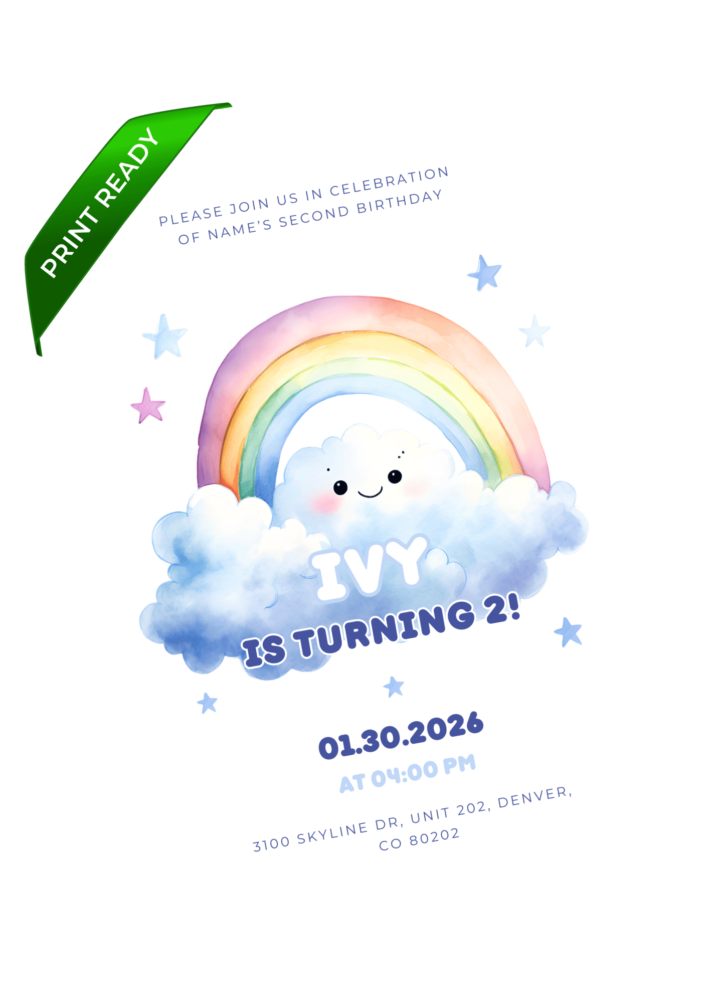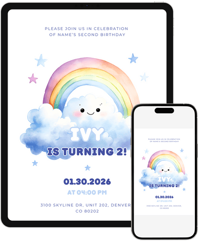 A cheerful rainbow birthday invitation with a smiling cloud, soft gradients, and a bright pastel palette. Great for celebrating little ones who love colorful, happy themes. Customize in Canva and send an invite that instantly lifts the mood.