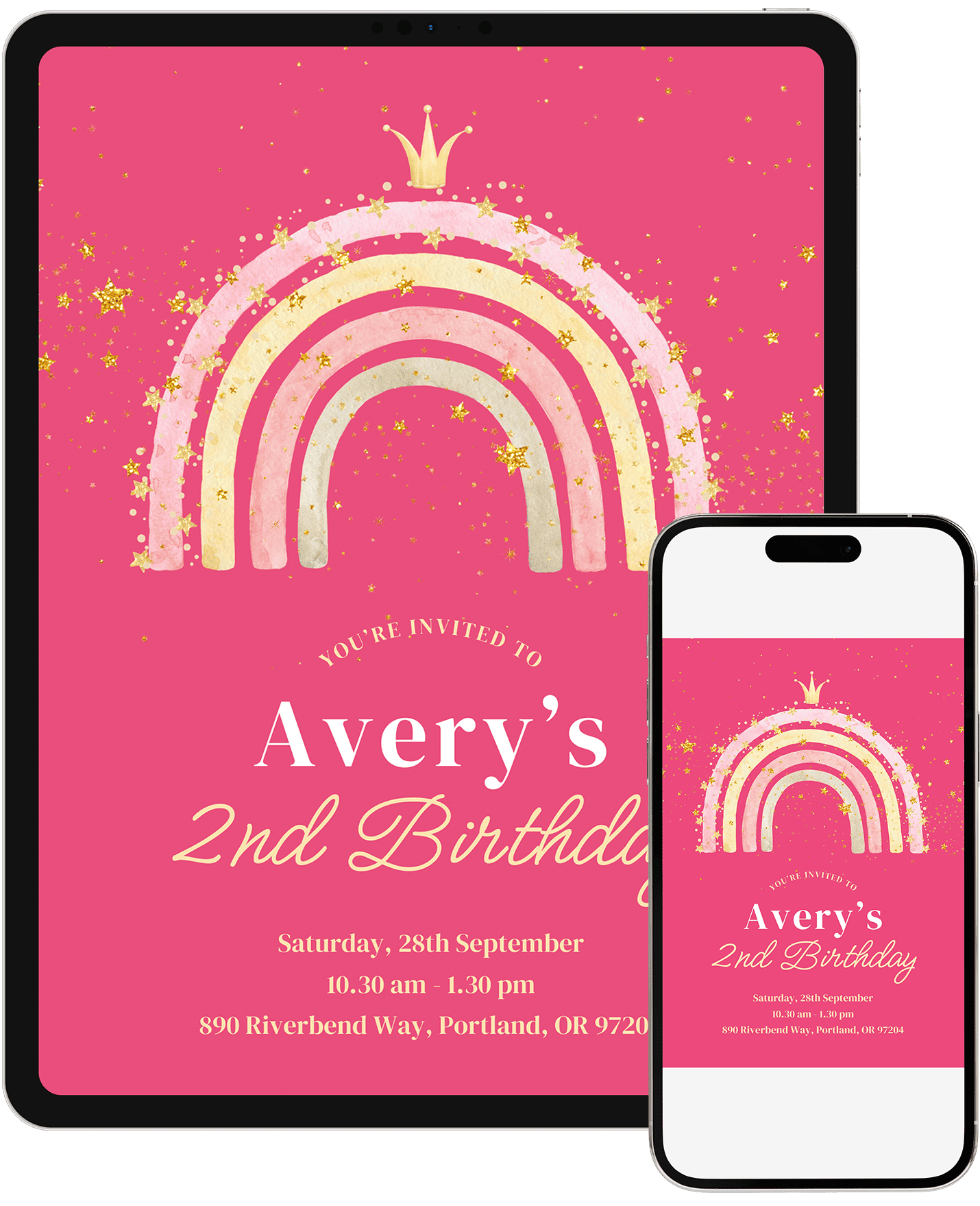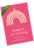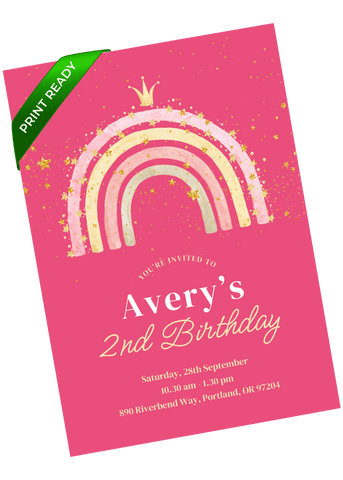 A vibrant pink rainbow birthday invitation filled with playful sparkle elements and a modern layout. This design is ideal for little ones drawn to bold colors and joyful details. Edit in Canva in minutes and send a lively invite that sets a fun party mood.