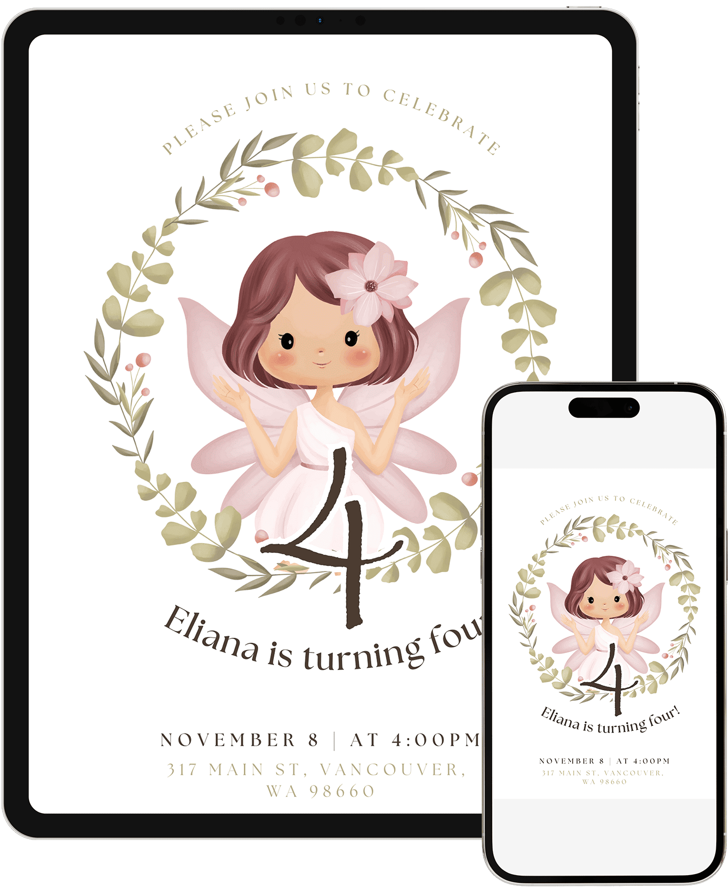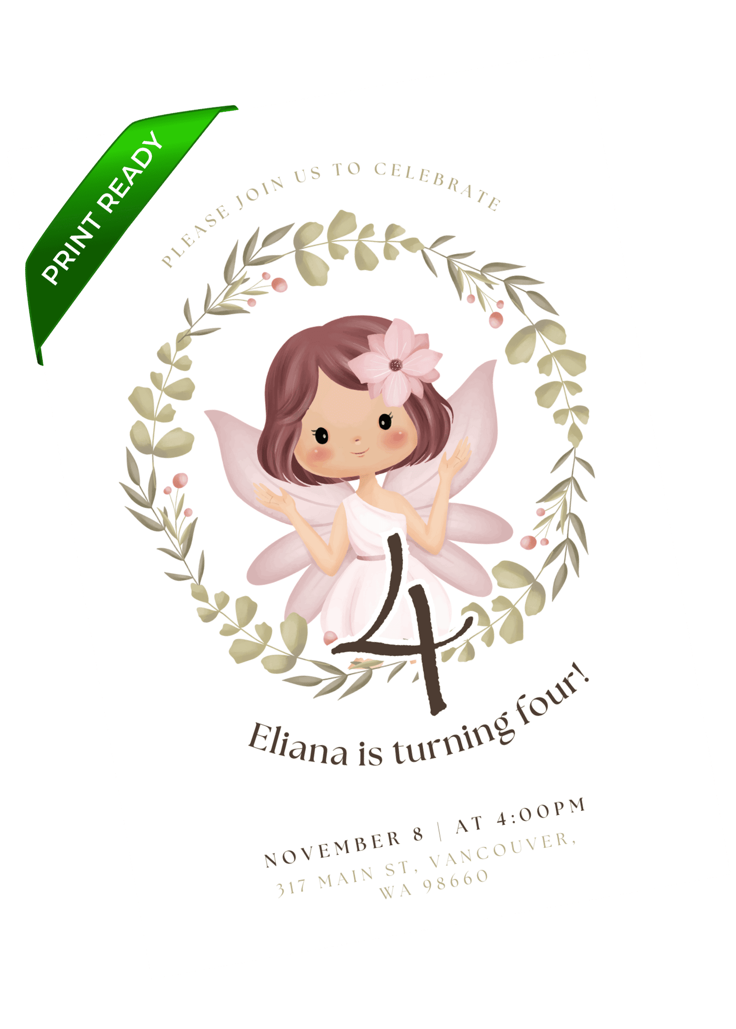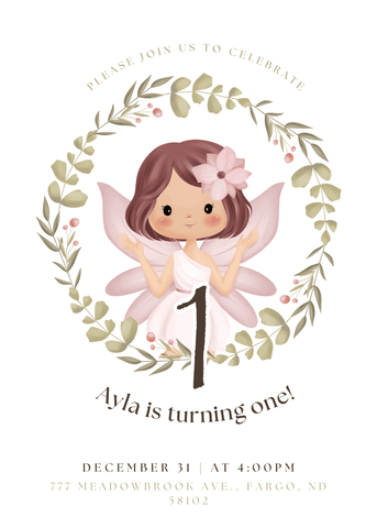 A gentle fairy birthday invitation featuring soft greenery, rosy tones, and a sweet illustrated fairy. A lovely choice for children who enjoy magical stories and soft, dreamy colors. Easily edit in Canva to create a heartfelt invite for a whimsical party.