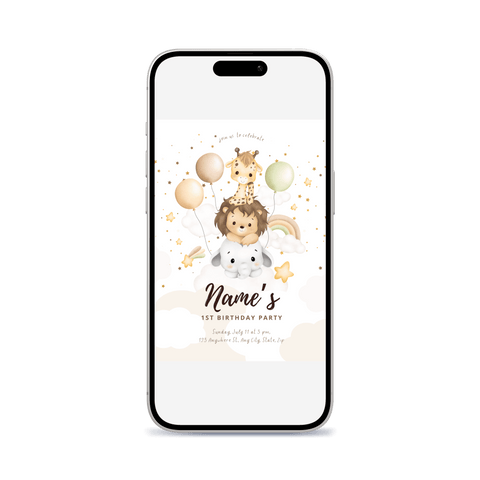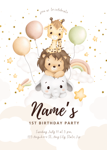 Sleek, modern animal, balloons, rainbow theme 1st - 5th birthday invitation template. Clean design meets contemporary style in this Canva-ready template. Perfect for parents who love minimalist aesthetics with maximum impact.