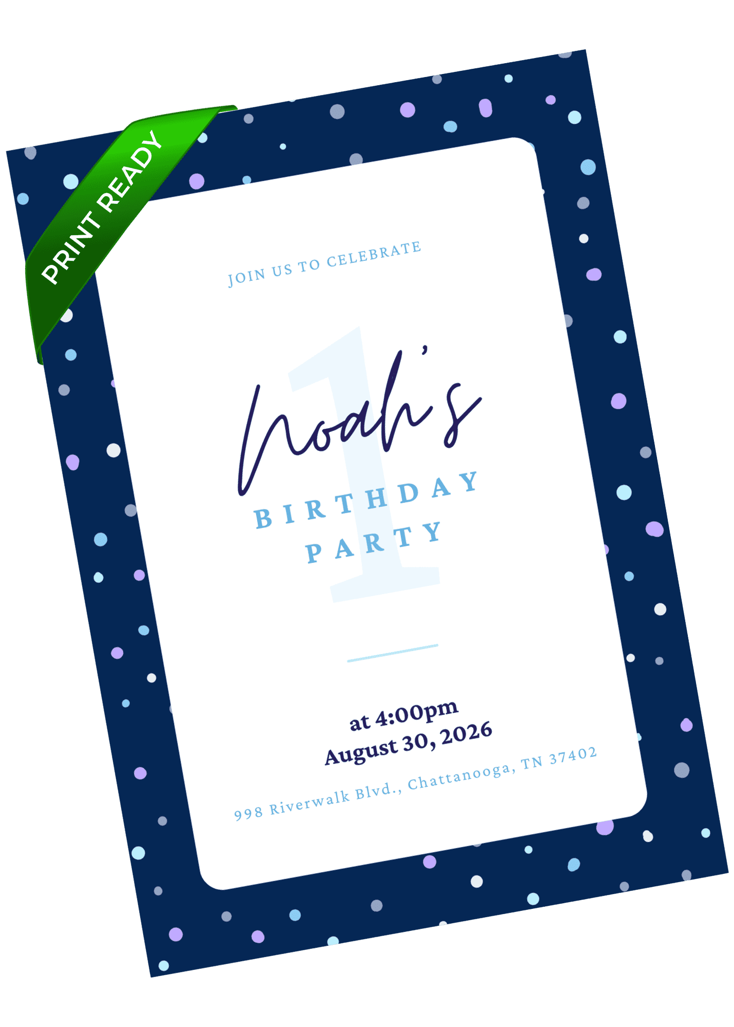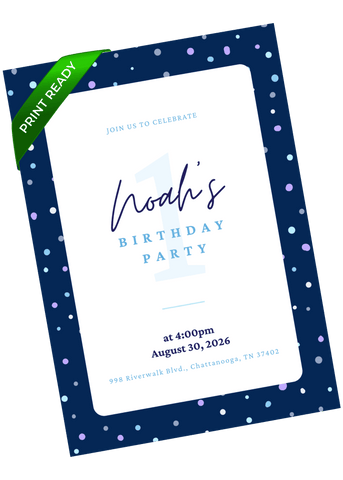A navy confetti invitation with a modern dotted border and clean typography. Great for families who want a simple, structured design with playful details. Edit in Canva and send a crisp, contemporary birthday invite.