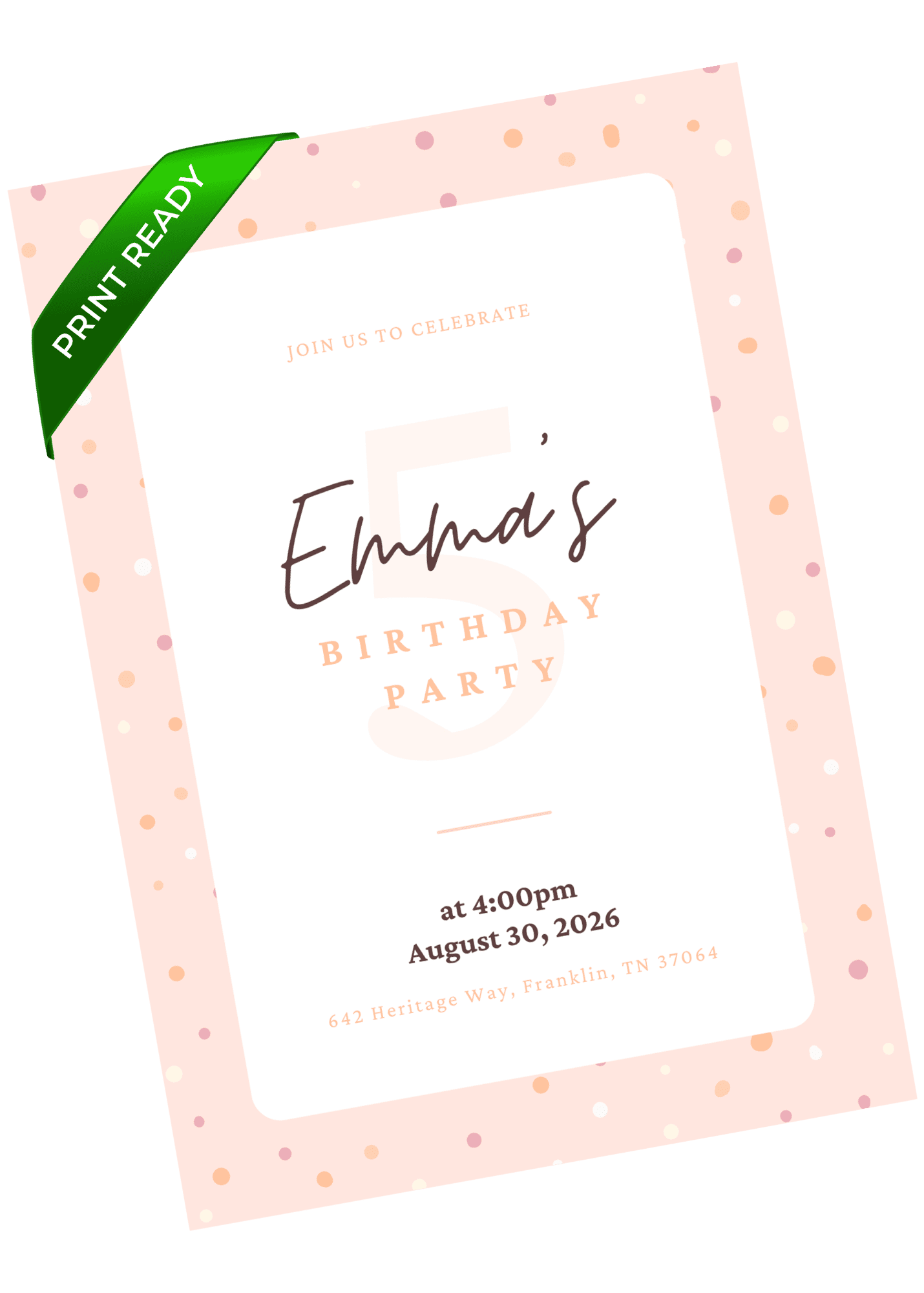 A soft peach confetti invitation with warm tones and a minimal layout. Perfect for a relaxed celebration with gentle color. Personalize in Canva and share a warm, welcoming invite that feels fresh and light.