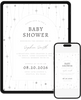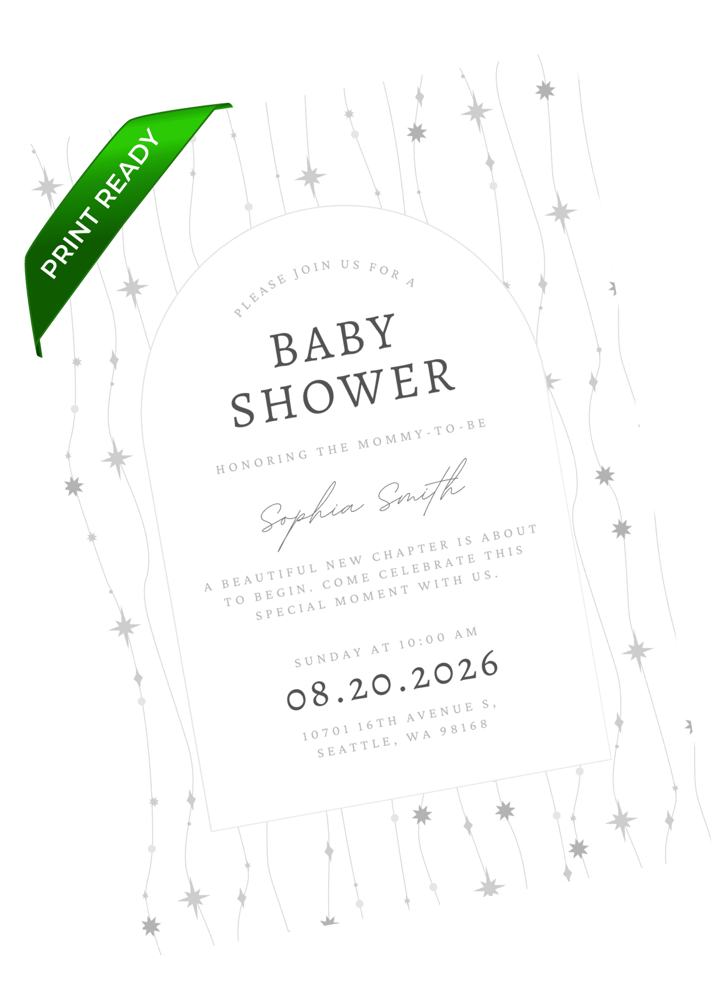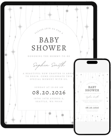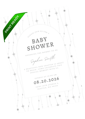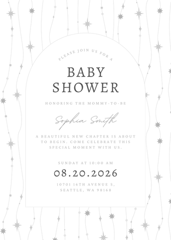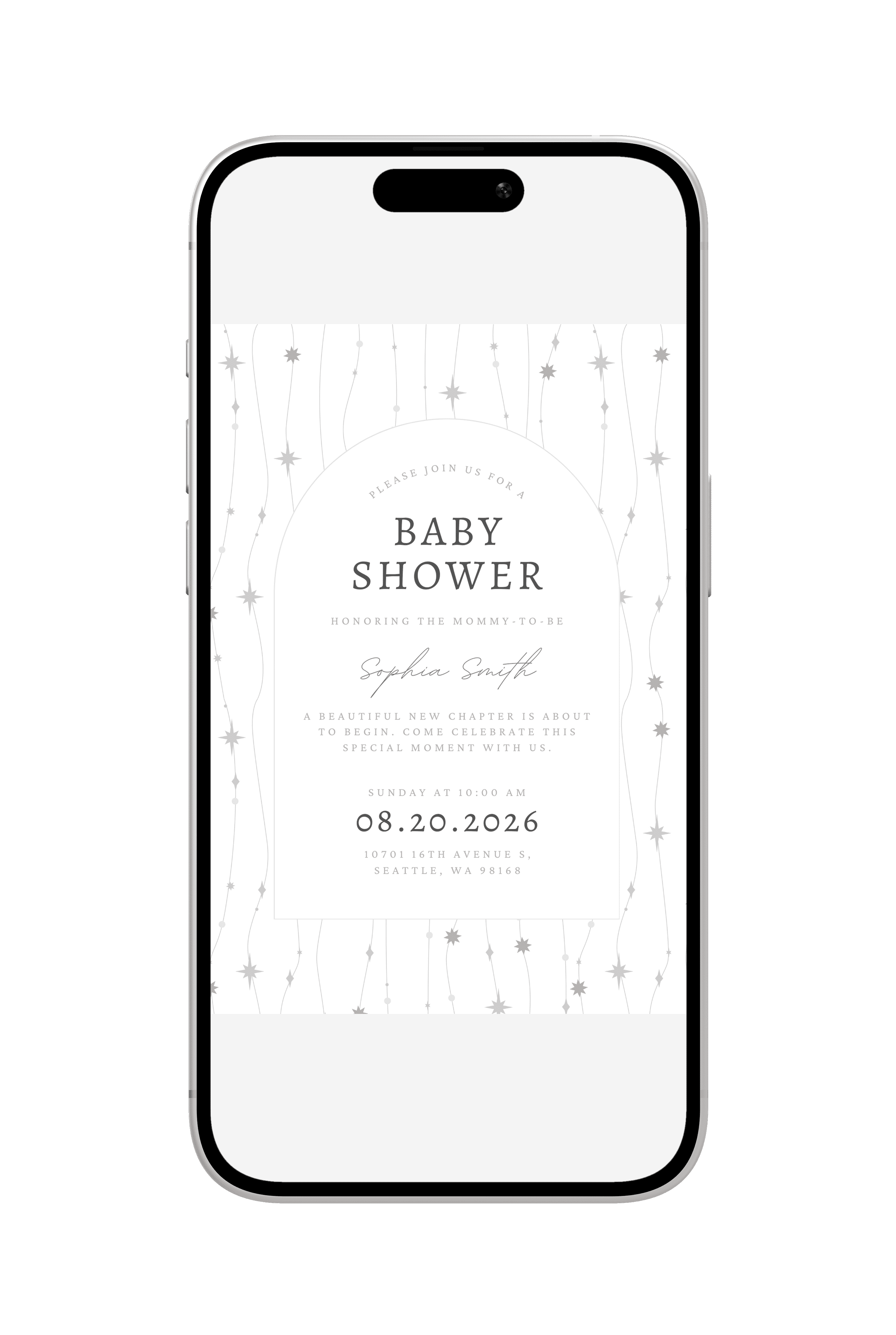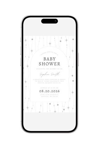 Silver star garlands shimmering against a clean white background - Starlit Silver is modern, celestial, and beautifully neutral. Perfect for a sophisticated baby shower with a twinkle. Customize in Canva instantly.