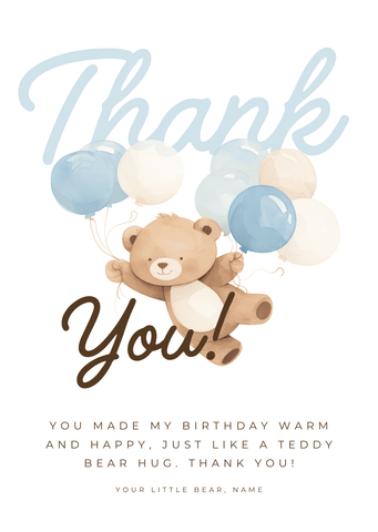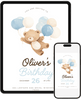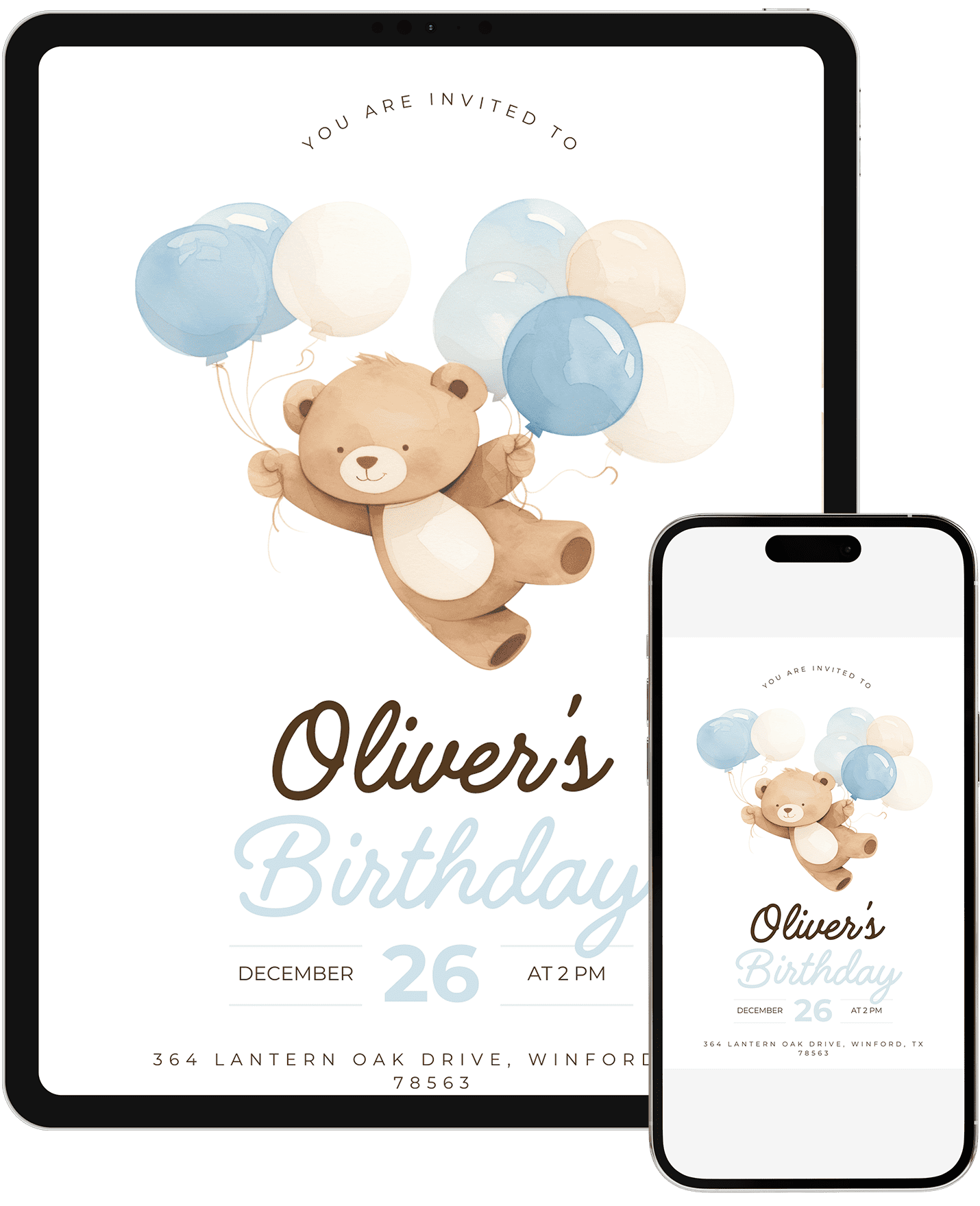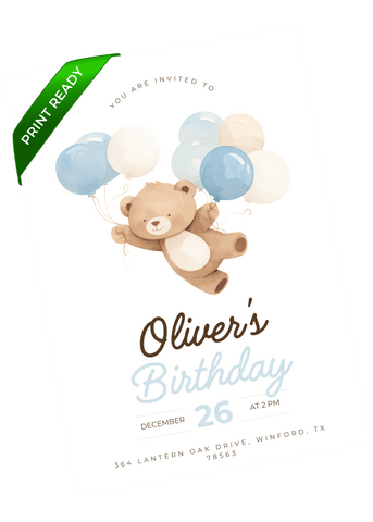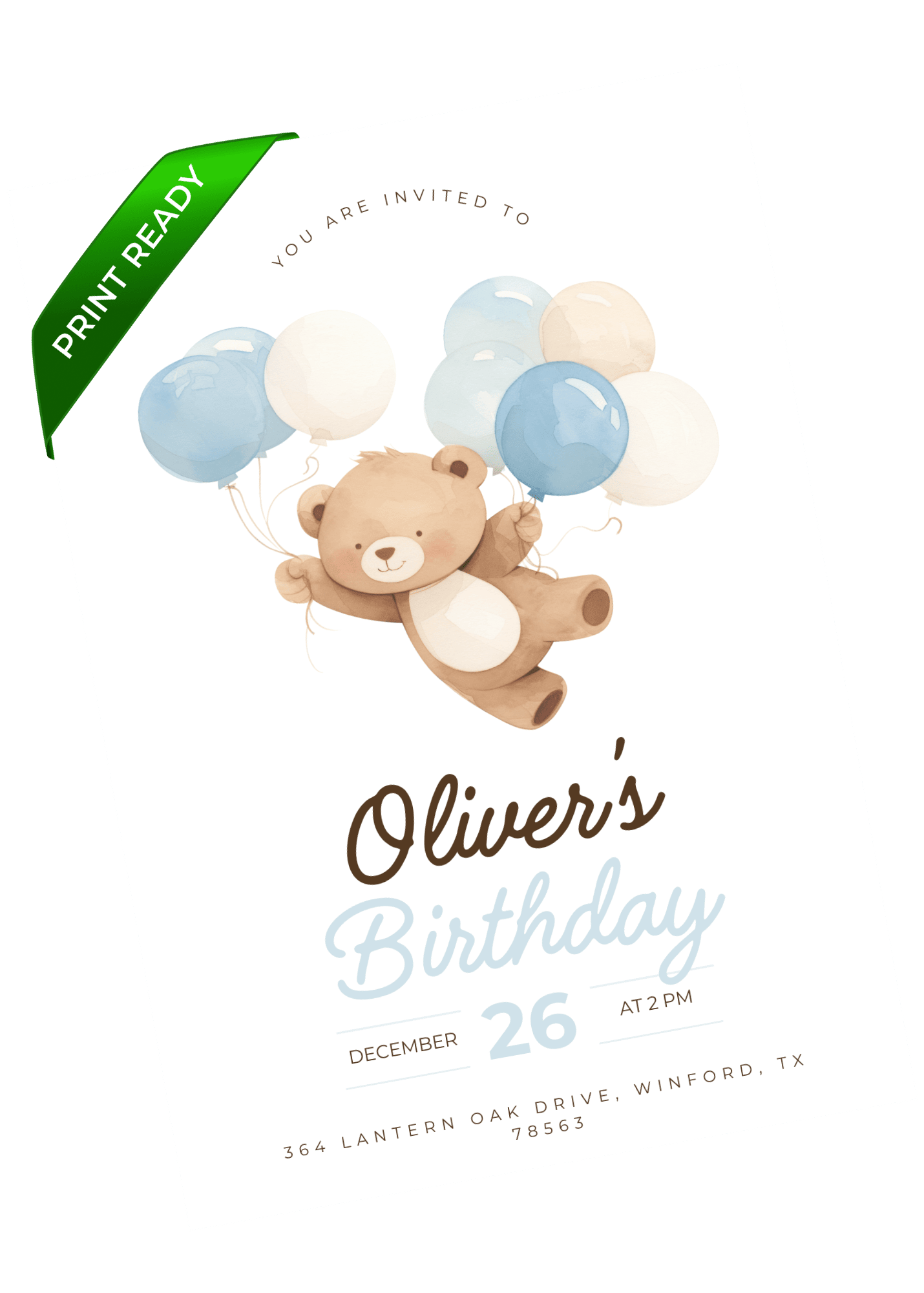 A soft and cheerful teddy bear birthday invitation featuring floating balloons and a clean blue backdrop. A lovely fit for little ones who enjoy gentle, playful characters. Customize instantly in Canva and share a warm, welcoming invite.
