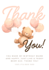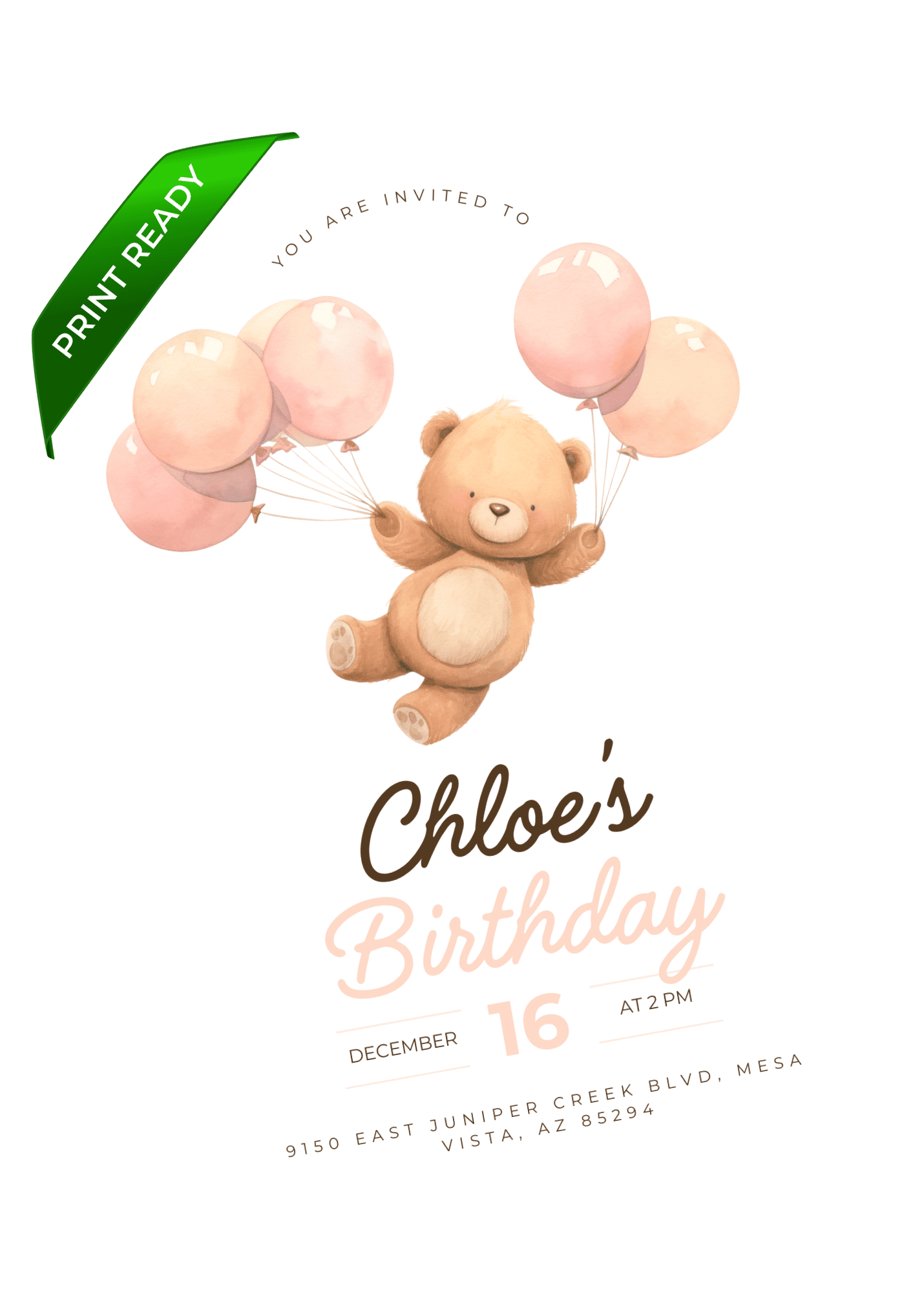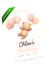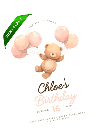 A soft pink birthday invitation featuring a sweet teddy holding balloons and gentle pastel details. A charming fit for little ones who love cuddly characters and calm, cozy designs. Edit in Canva and send a warm, adorable invite.