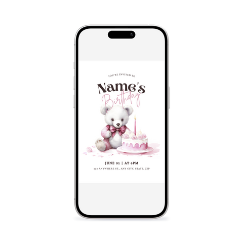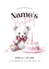 A charming pink birthday invitation with a friendly teddy bear and cake illustration. Great for gentle, cozy birthday themes children adore. Customize in Canva and send a warm, delightful invite for a memorable celebration.