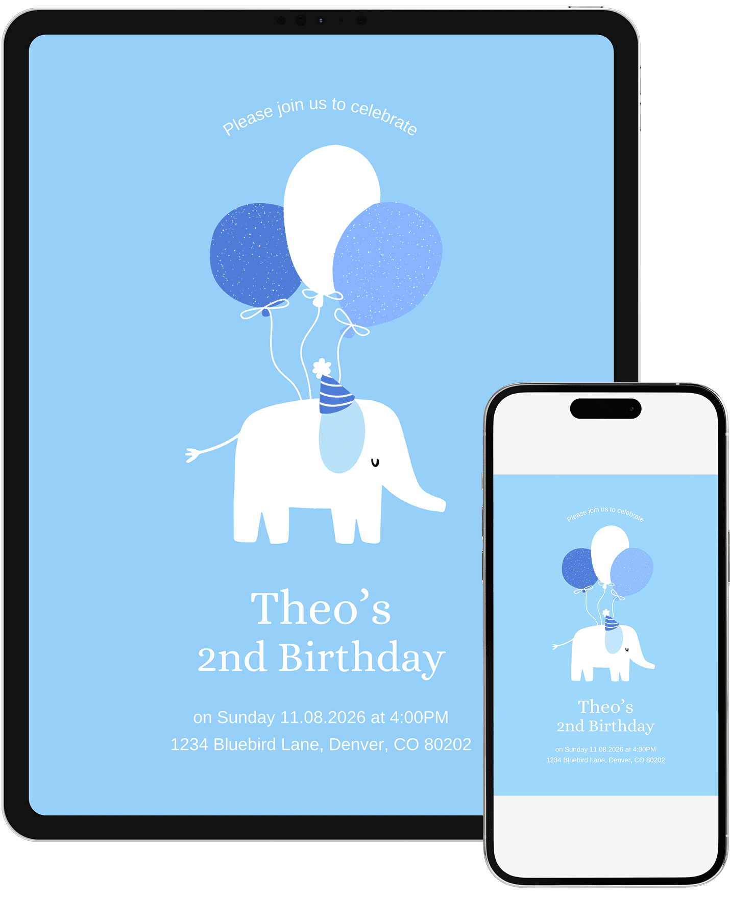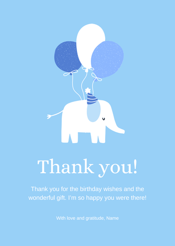 A simple and modern elephant birthday invitation with clean lines and blue balloon accents. Nice for families wanting a minimalist, character-focused design. Customize in Canva and send a fun, easy-to-read invite for any first birthday.