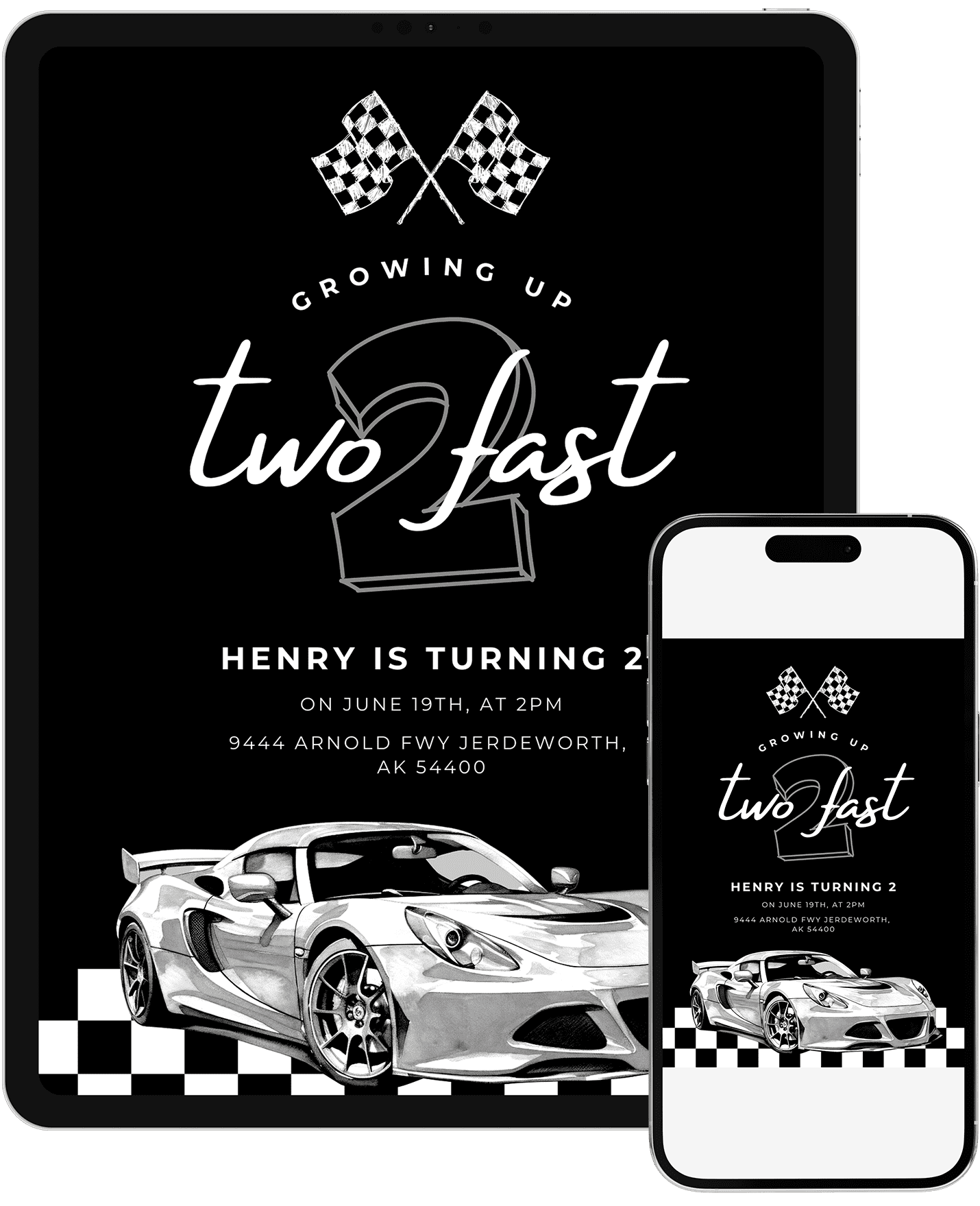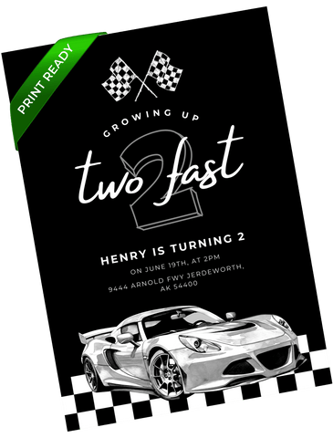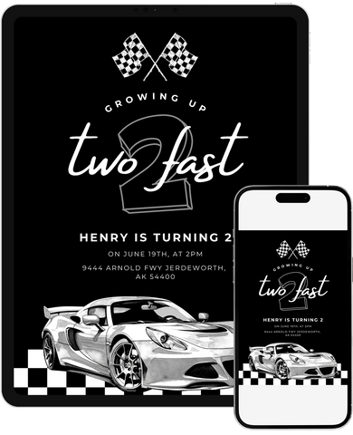 A bold racing invitation featuring a midnight track backdrop, checkered flags, and an illustrated race car. A fun pick for little ones obsessed with cars, speed, and anything race themed. Easily customizable in Canva for a clean digital or printable invite.