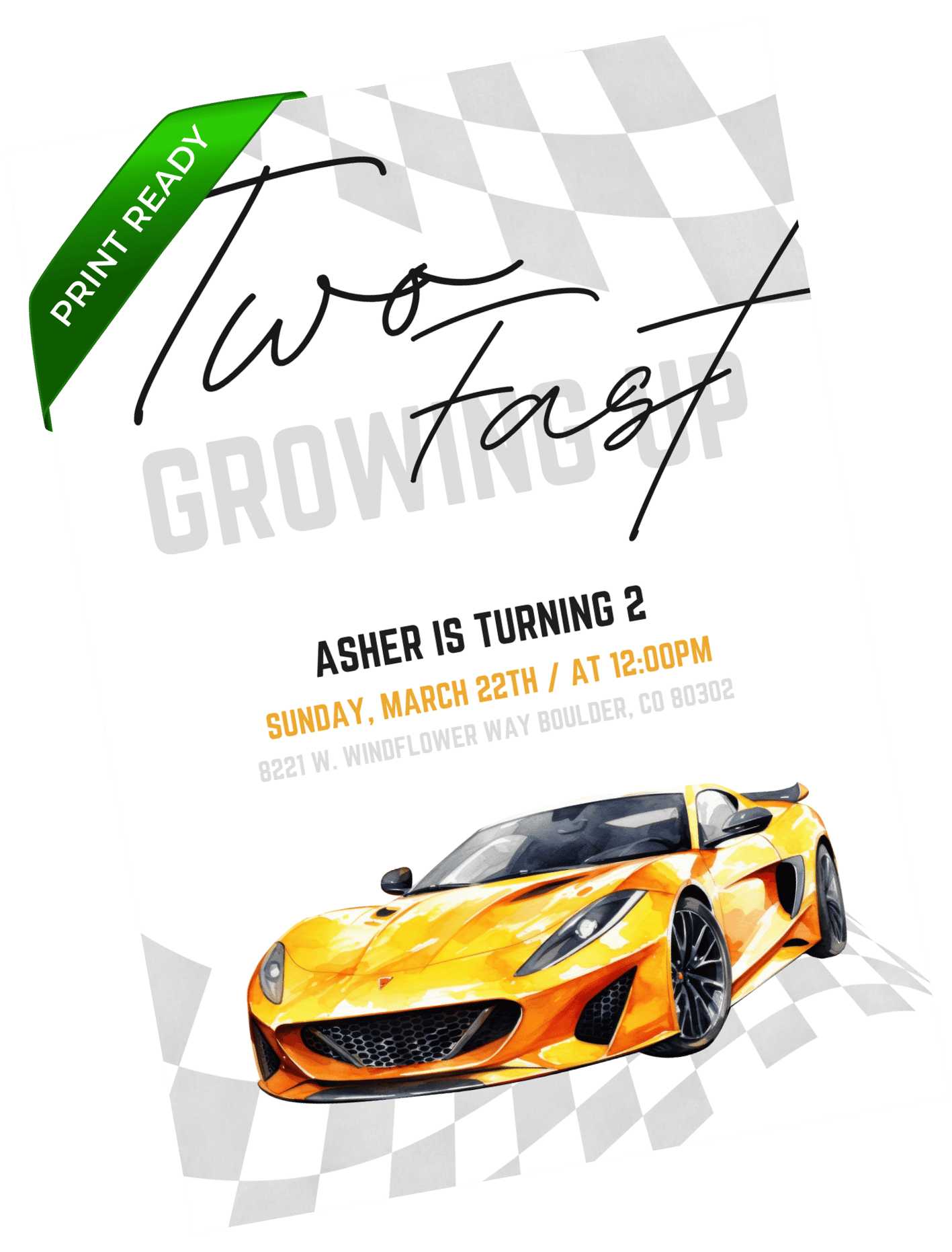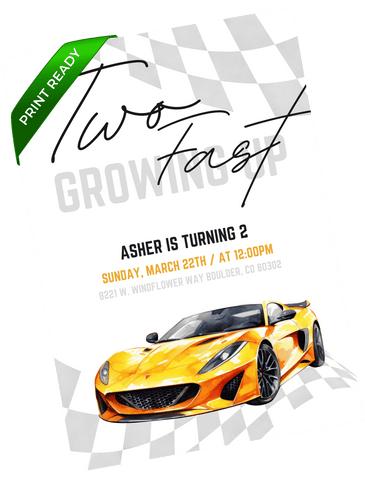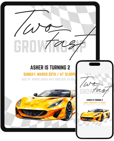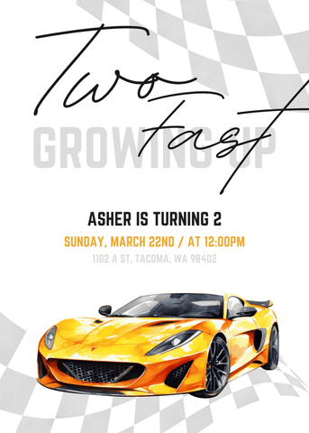 A sleek and modern race car invitation with a clean checkered layout and bright yellow accents. This design stands out for little car fans who love a polished look. Edit in Canva and send a stylish invite that feels fast and fun.