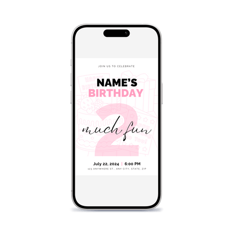 Sleek, modern two much fun theme 2nd birthday invitation template. Clean design meets contemporary style in this Canva-ready template. Perfect for parents who love minimalist aesthetics with maximum impact.