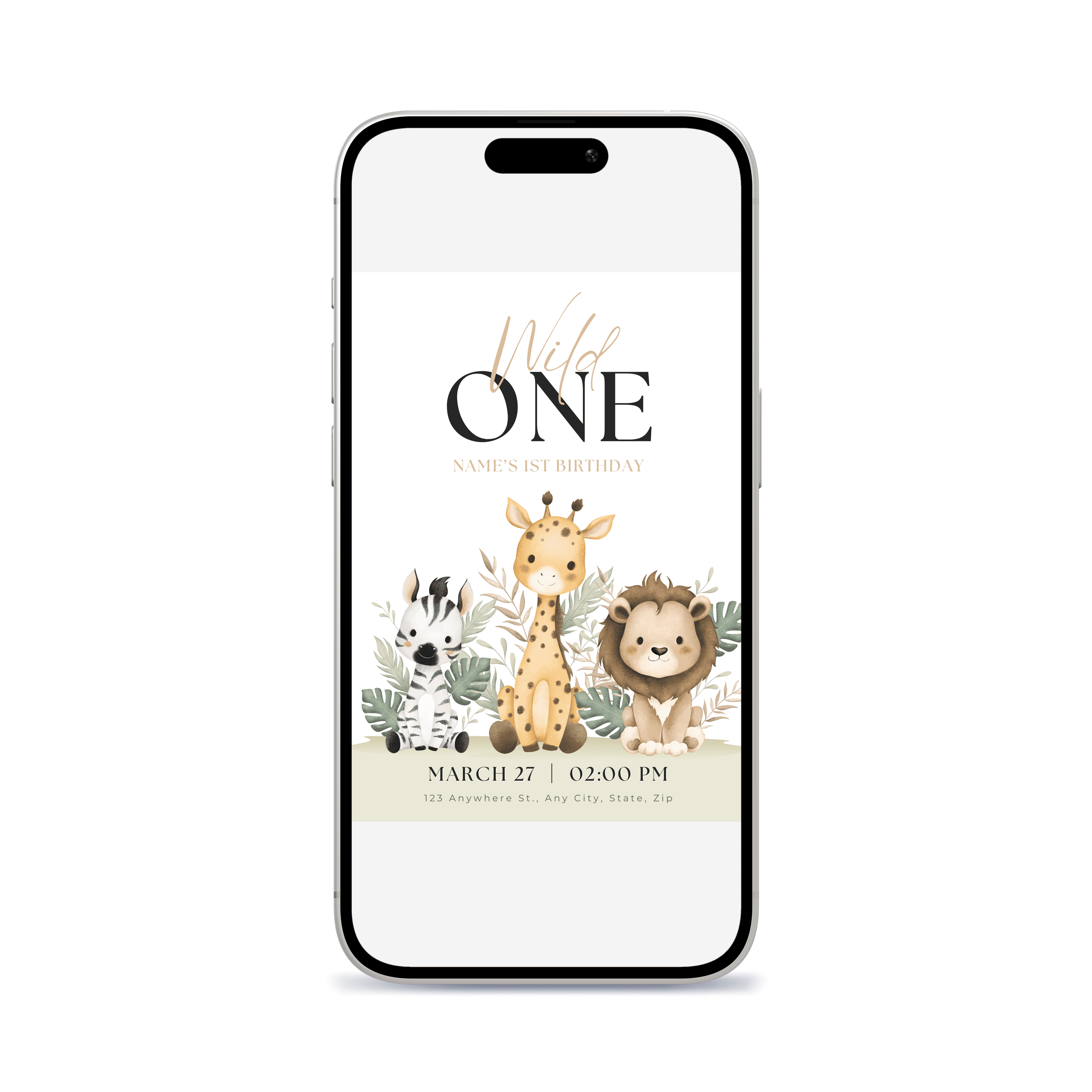 Sleek, modern wild one theme 1st birthday invitation template. Clean design meets contemporary style in this Canva-ready template. Perfect for parents who love minimalist aesthetics with maximum impact.