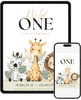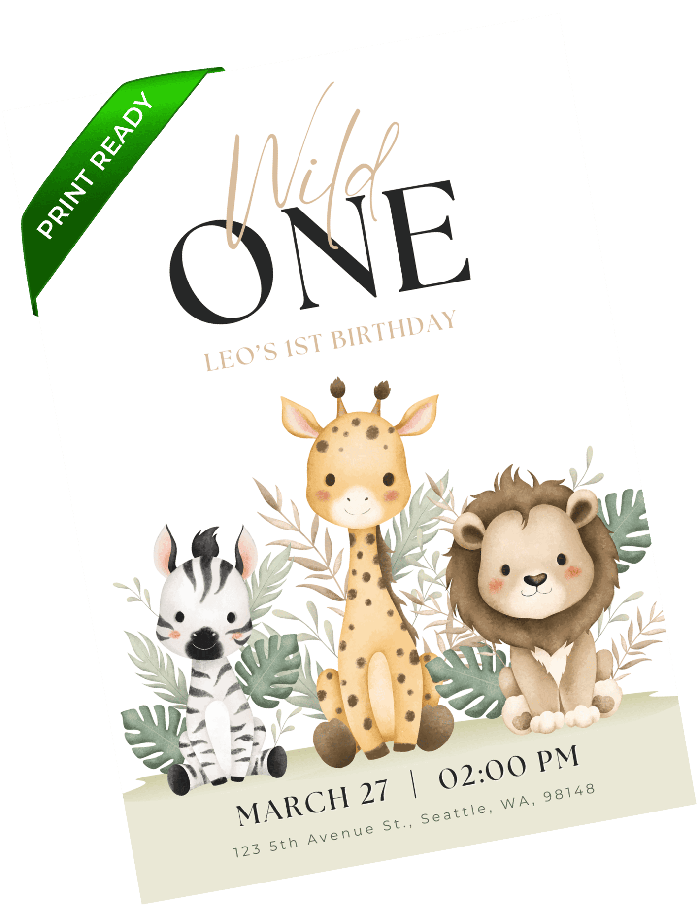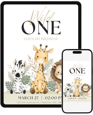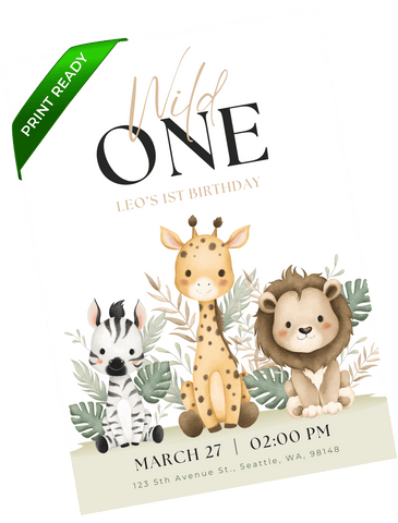 A sweet Wild One birthday invitation featuring gentle safari animals and soft greenery. A great choice for little ones who love friendly animal characters. Easily customize in Canva and share a warm, charming invite that feels fresh and modern.